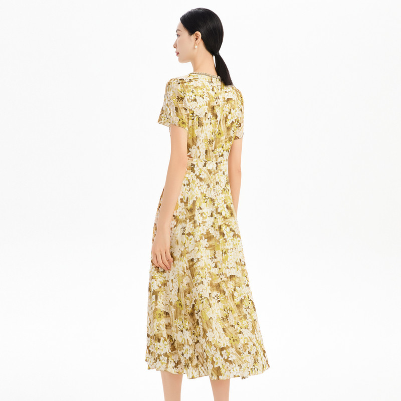 NAERSI娜尔思时尚 裙子 气质印花领口高级感珠钻连衣裙度假风春秋季