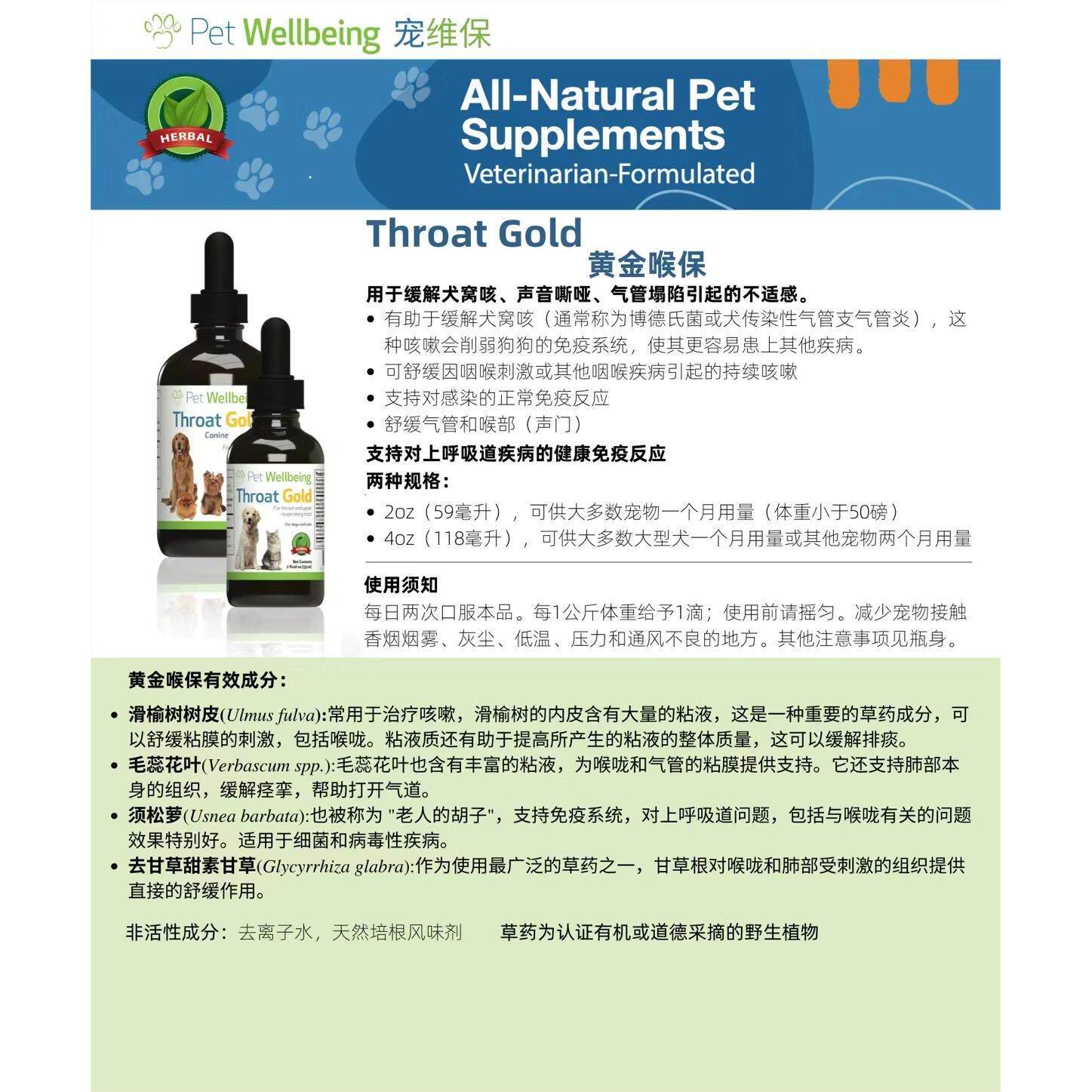 为您提供商品wellbeing喉金喉宝舒缓喉咙上呼吸道气管草本猫狗咳嗽 美国pet的详细介绍,