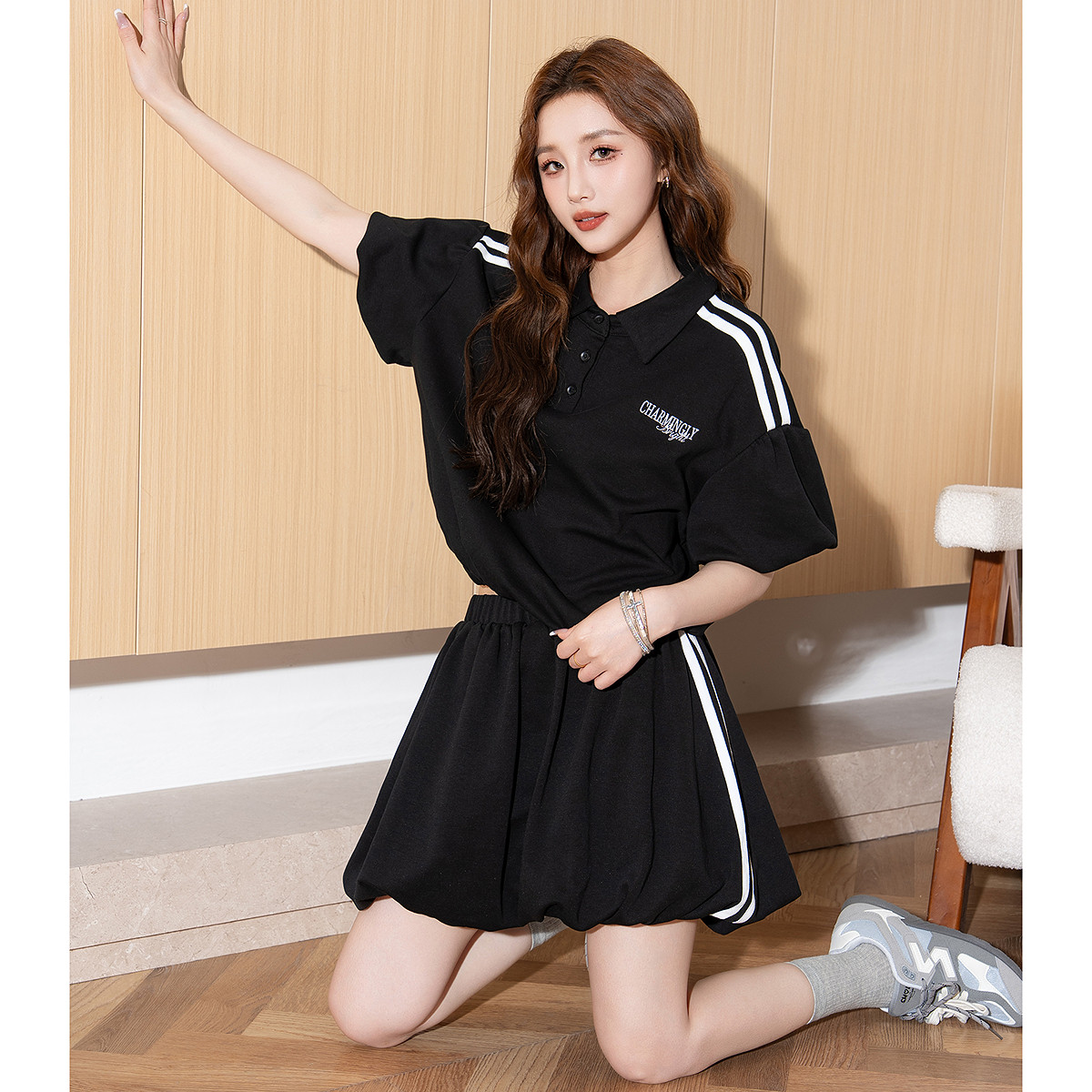 polo衫 花苞半身裙一整套黑色穿搭Q 女夏新款 唐狮休闲运动套装