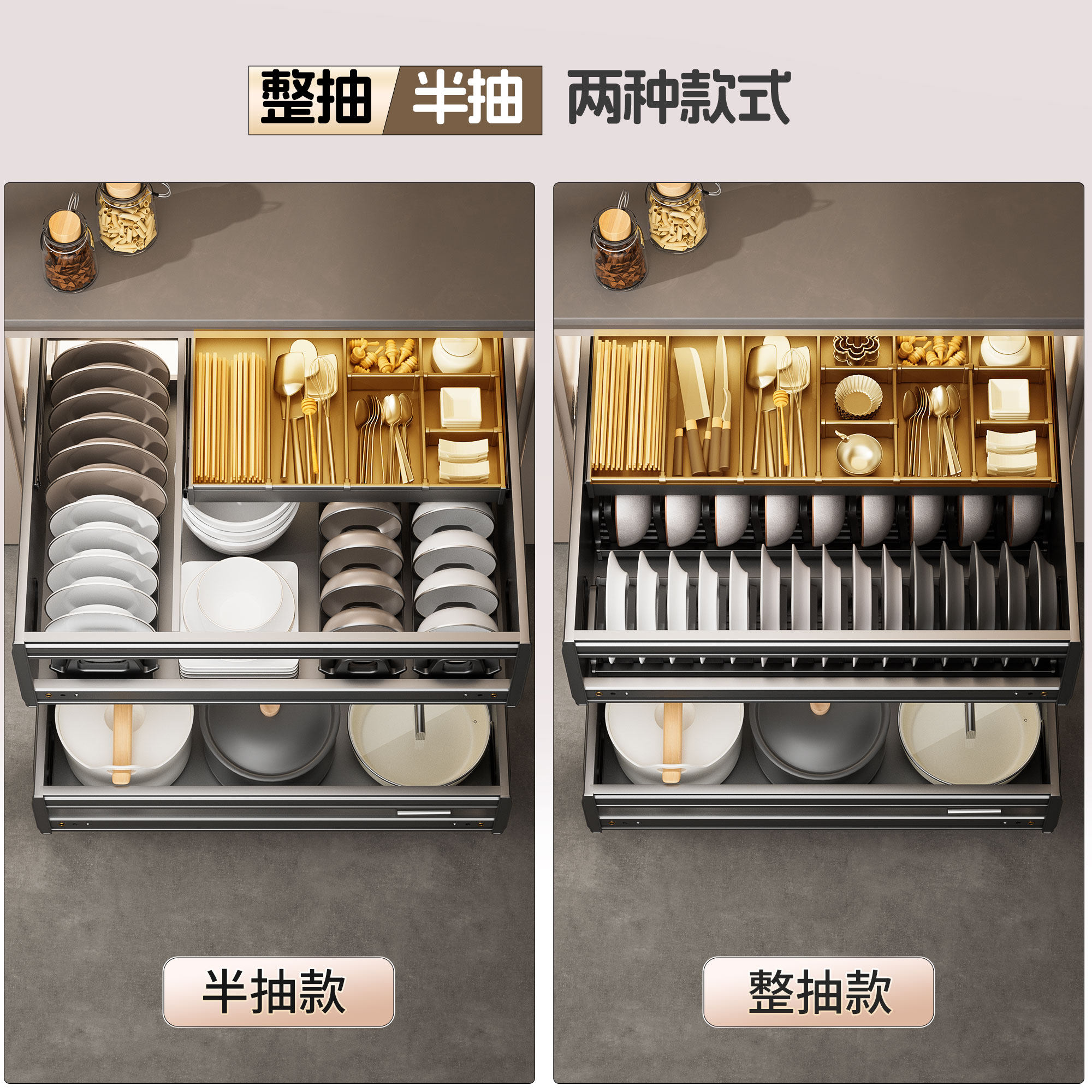 碗碟拉篮厨房橱柜抽屉式 碗柜太空铝合金碗架 双层抽中抽加深抽拉式
