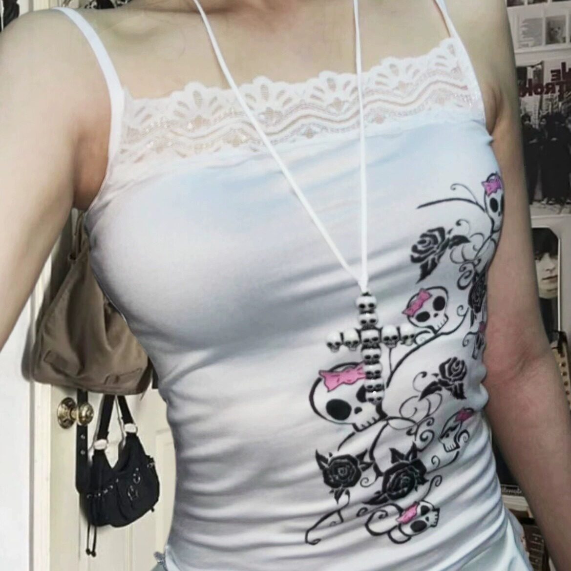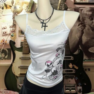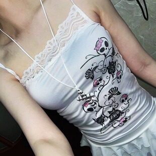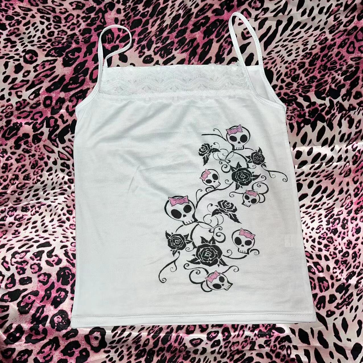 原创设计cybery2k亚文化哥特朋克玫瑰骷髅印花蕾丝边吊带内搭女