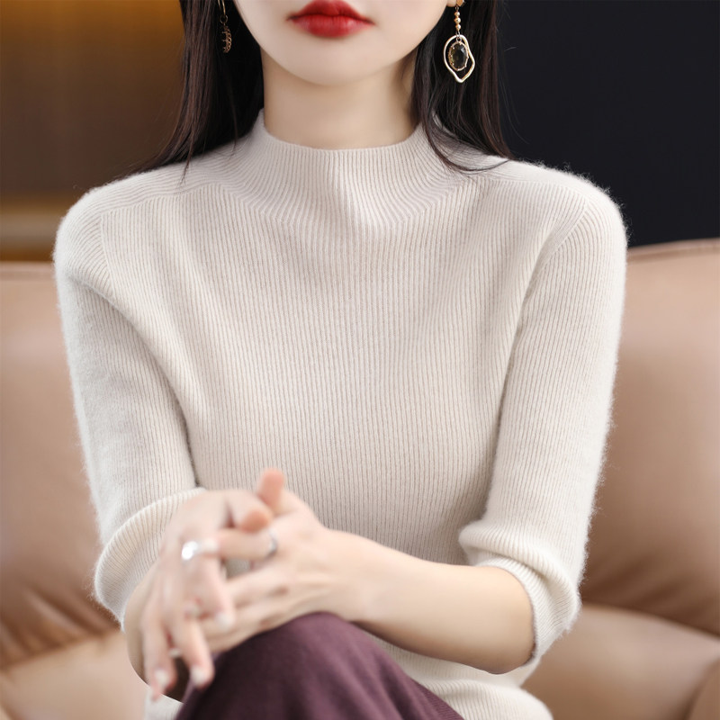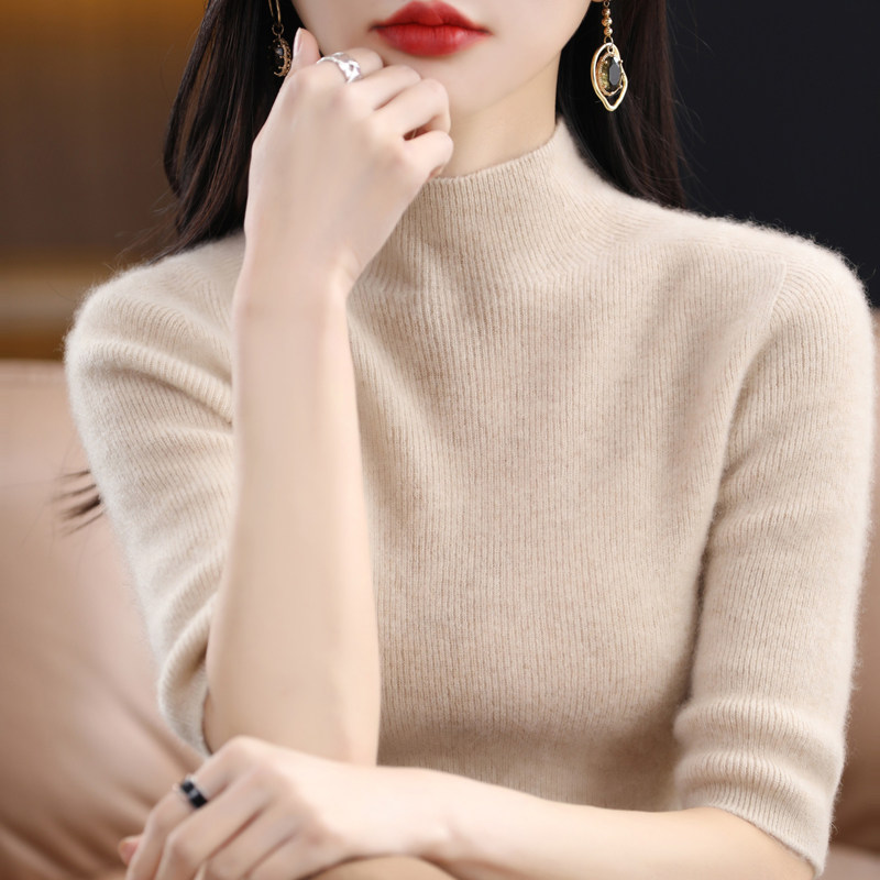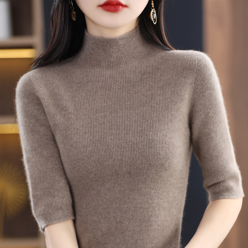 套头纯羊毛中领中袖 新款 毛衣女半高领五分袖 针织上衣羊毛衫 打底衫