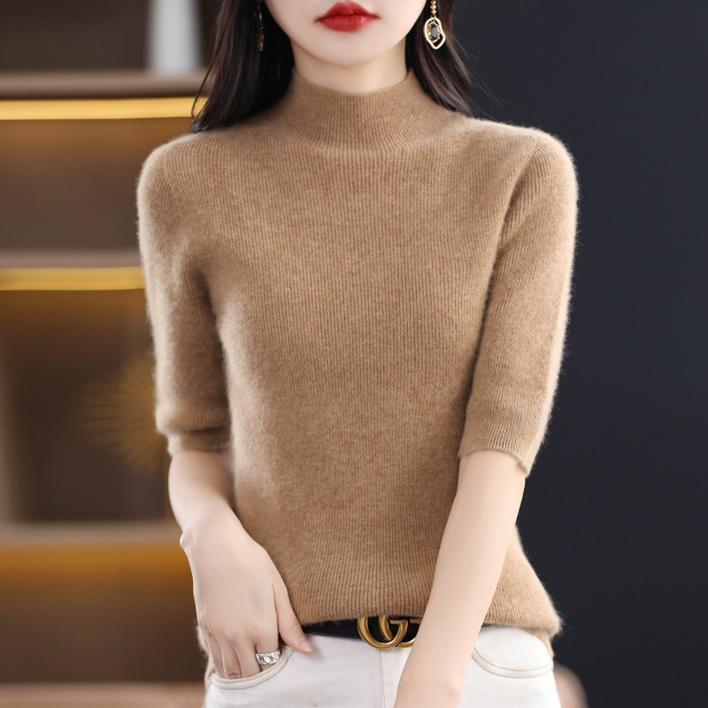 套头纯羊毛中领中袖 新款 毛衣女半高领五分袖 针织上衣羊毛衫 打底衫由