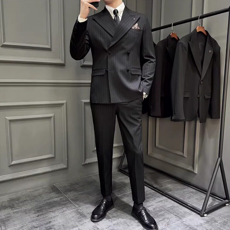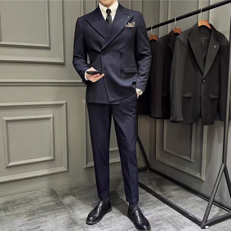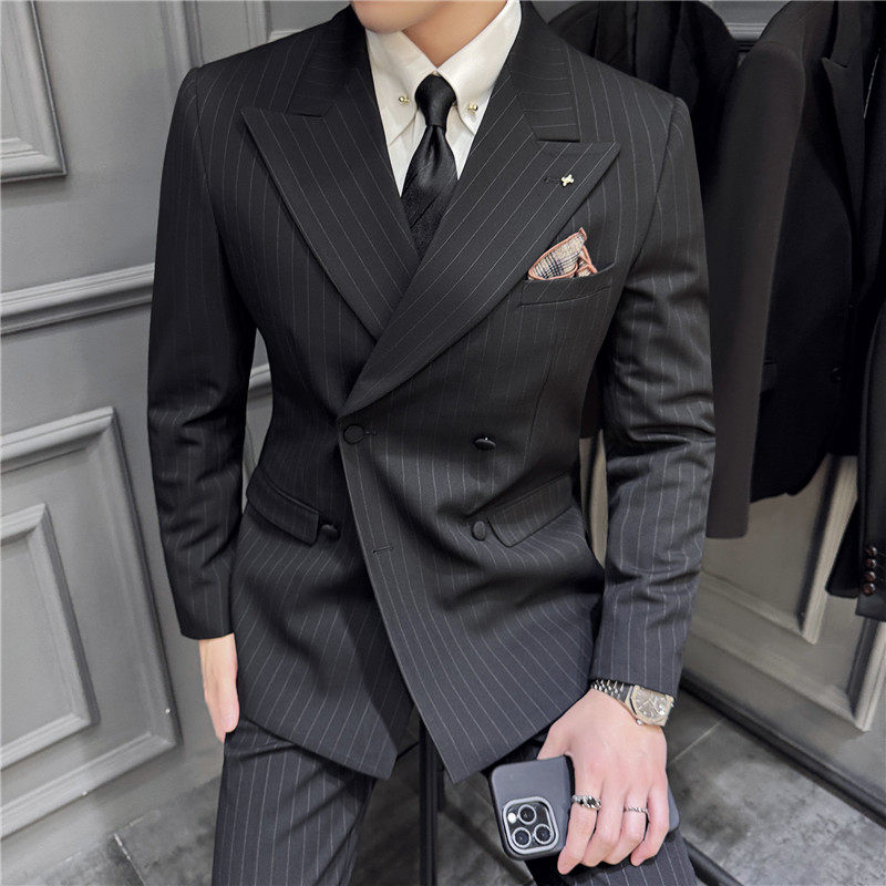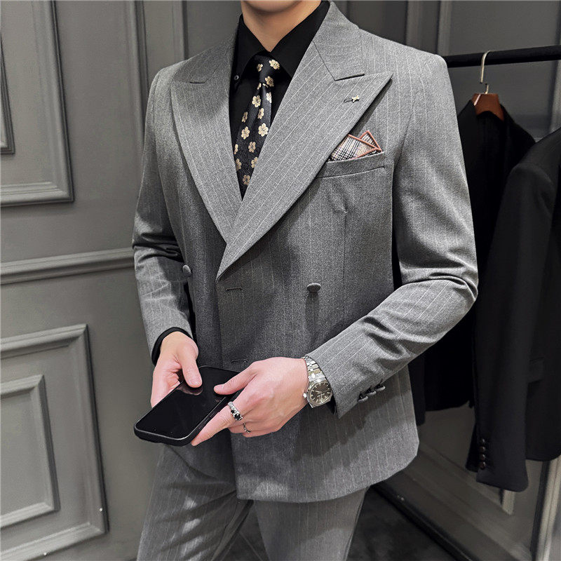 高档大戗驳领双排扣西服商务修身 色织条纹西装 三件套正装 礼服 男士