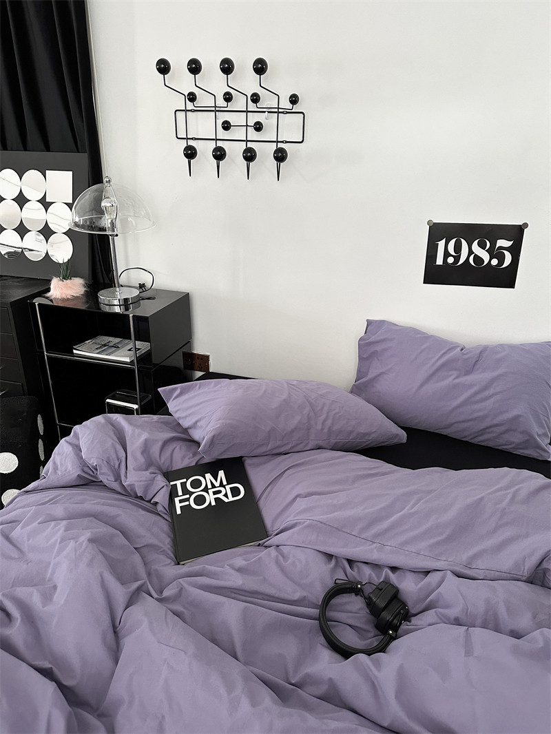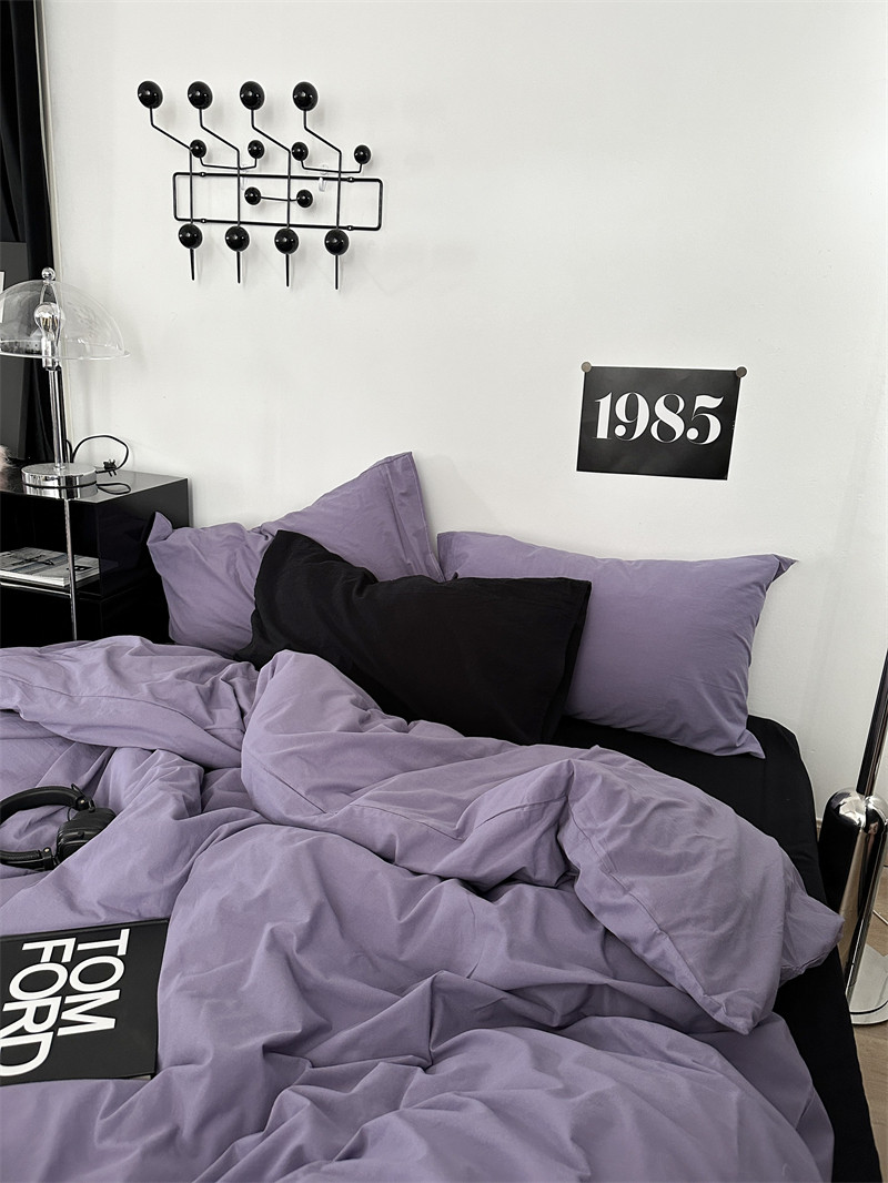 梨梦 ins黑紫色混搭全棉水洗棉四件套纯棉床单被套床品 紫雾森林