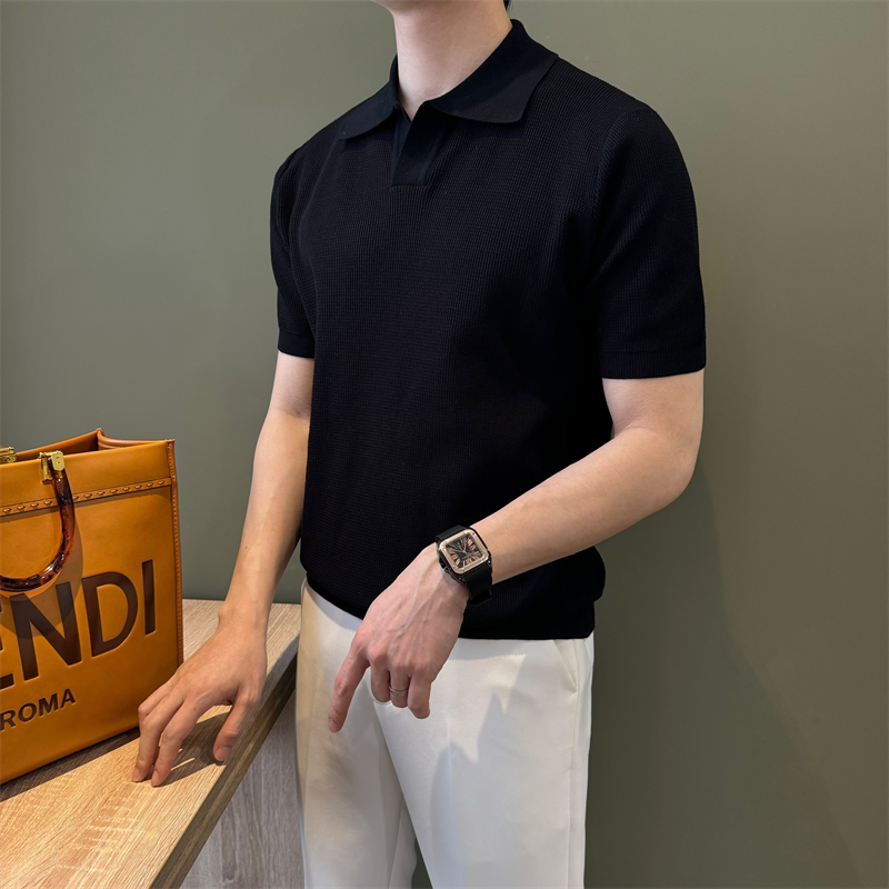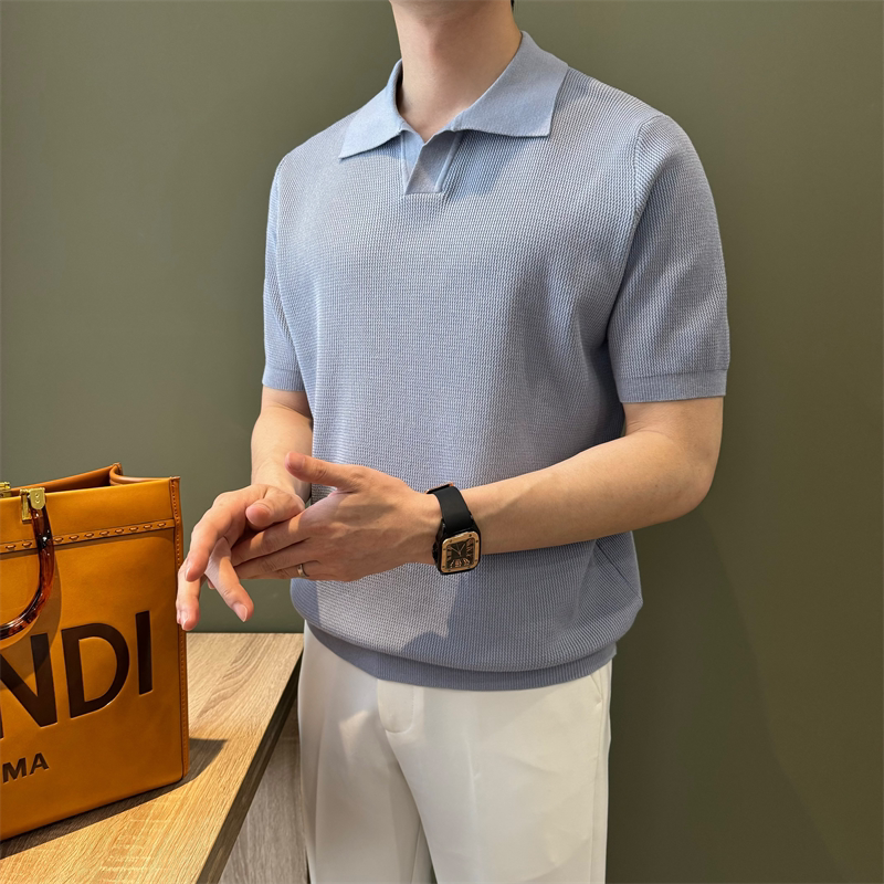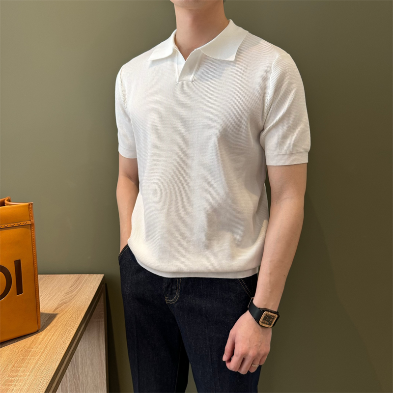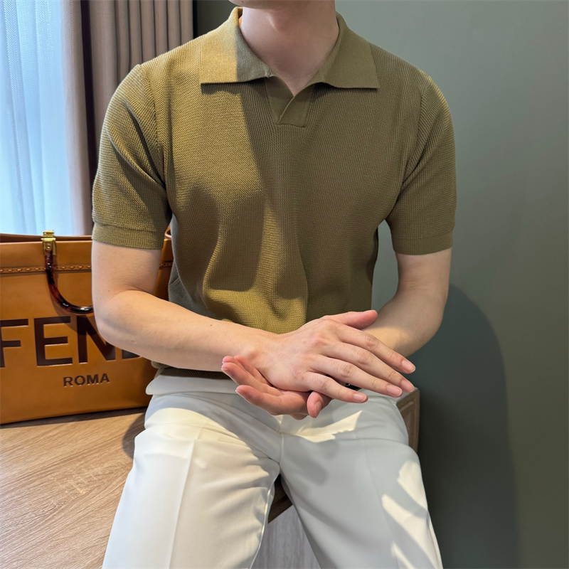 NR先生夏季 Polo针织衫 通勤宽松慵懒垂感V翻领纯色短袖 T恤 轻奢男士