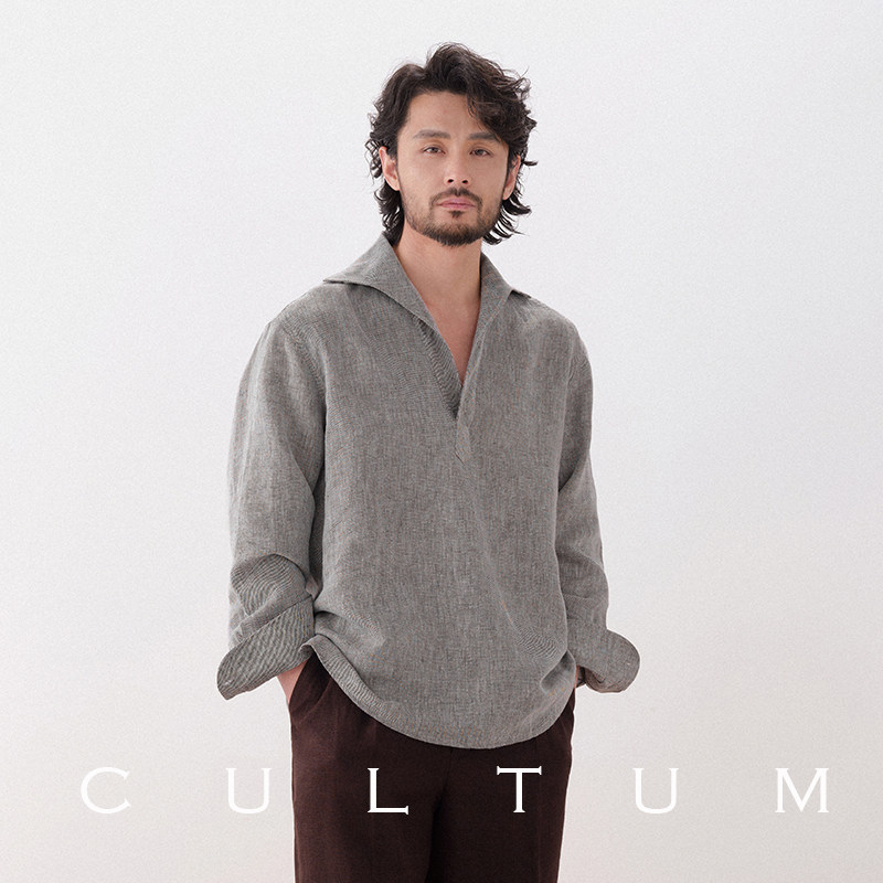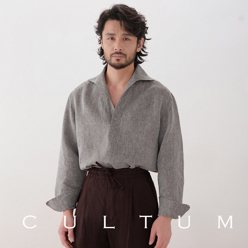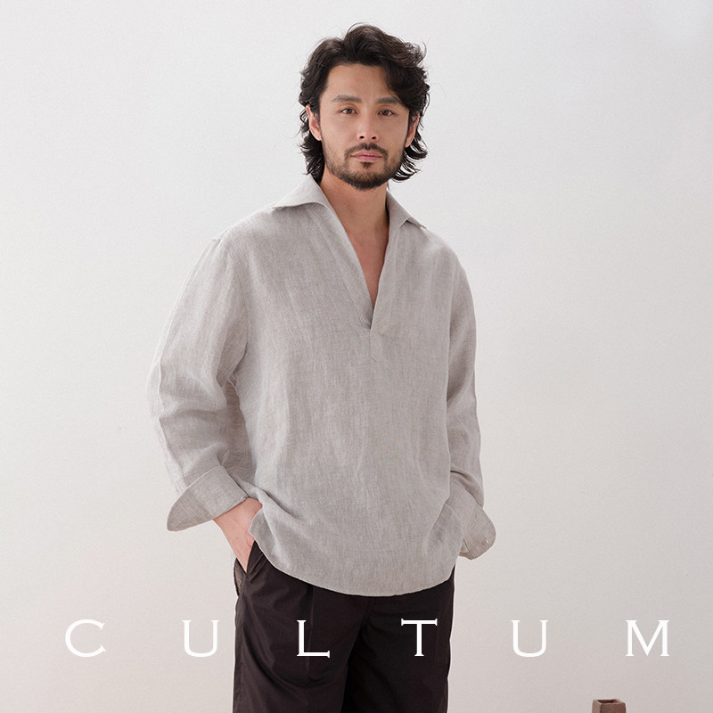 CULTUM休闲宽松一片领半开襟衬衫 男慵懒松弛衬衣 100%法国亚麻由
