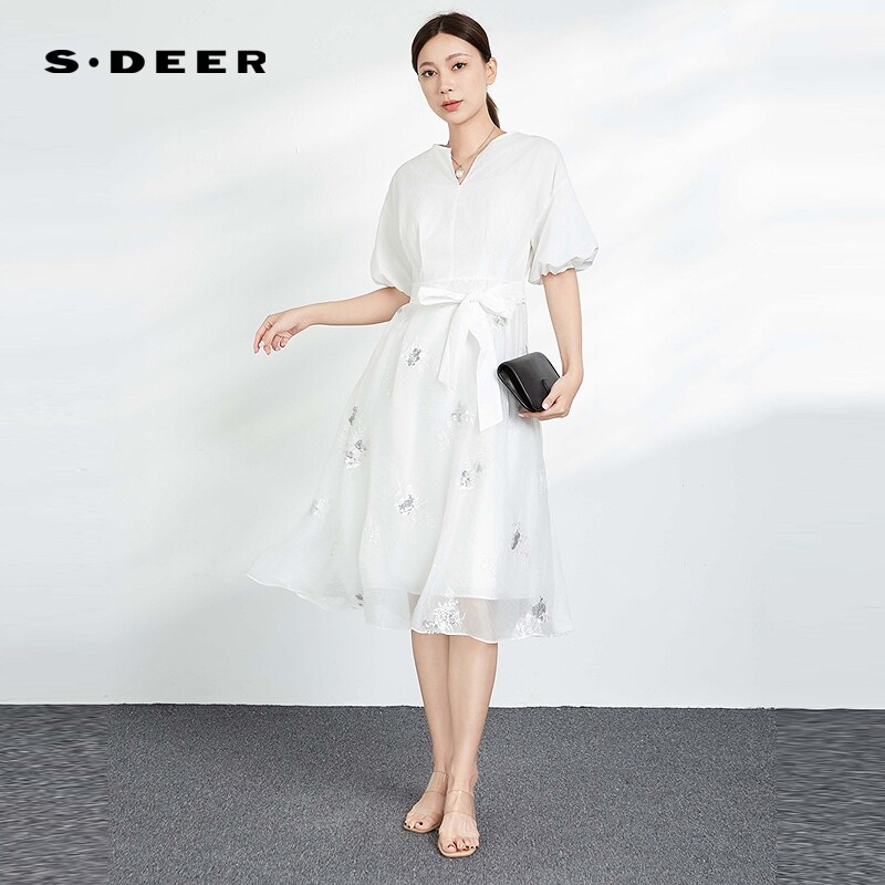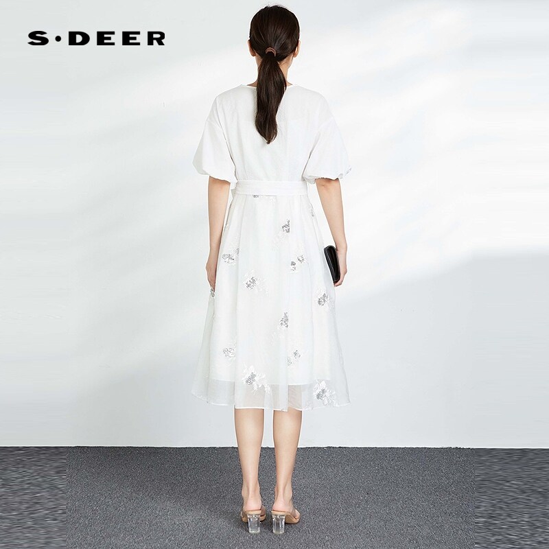 V领收腰网纱绣花泡泡袖 连衣裙S242Z12S9 女装 sdeer圣迪奥夏季