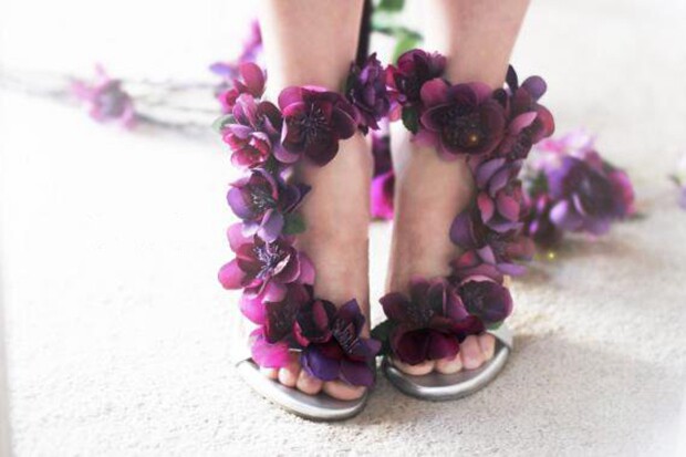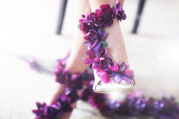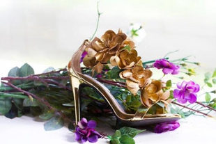 美国代购 Elegant◇手作优雅金色花紫色花卉浪漫婚礼新娘高跟鞋
