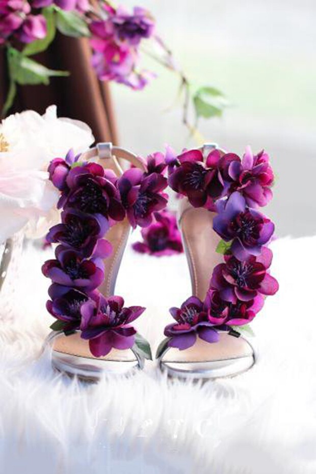 美国代购 Elegant◇手作优雅金色花紫色花卉浪漫婚礼新娘高跟鞋由