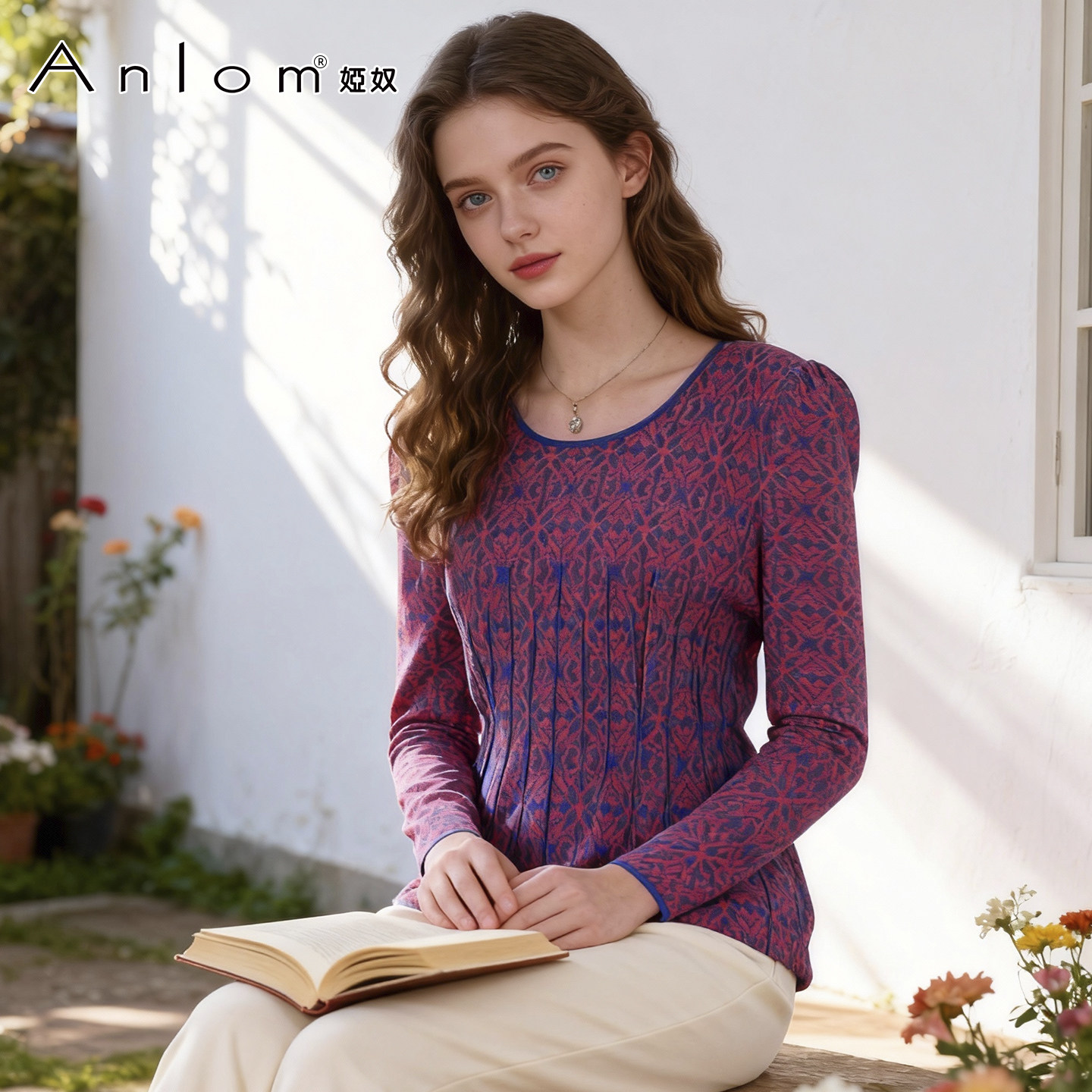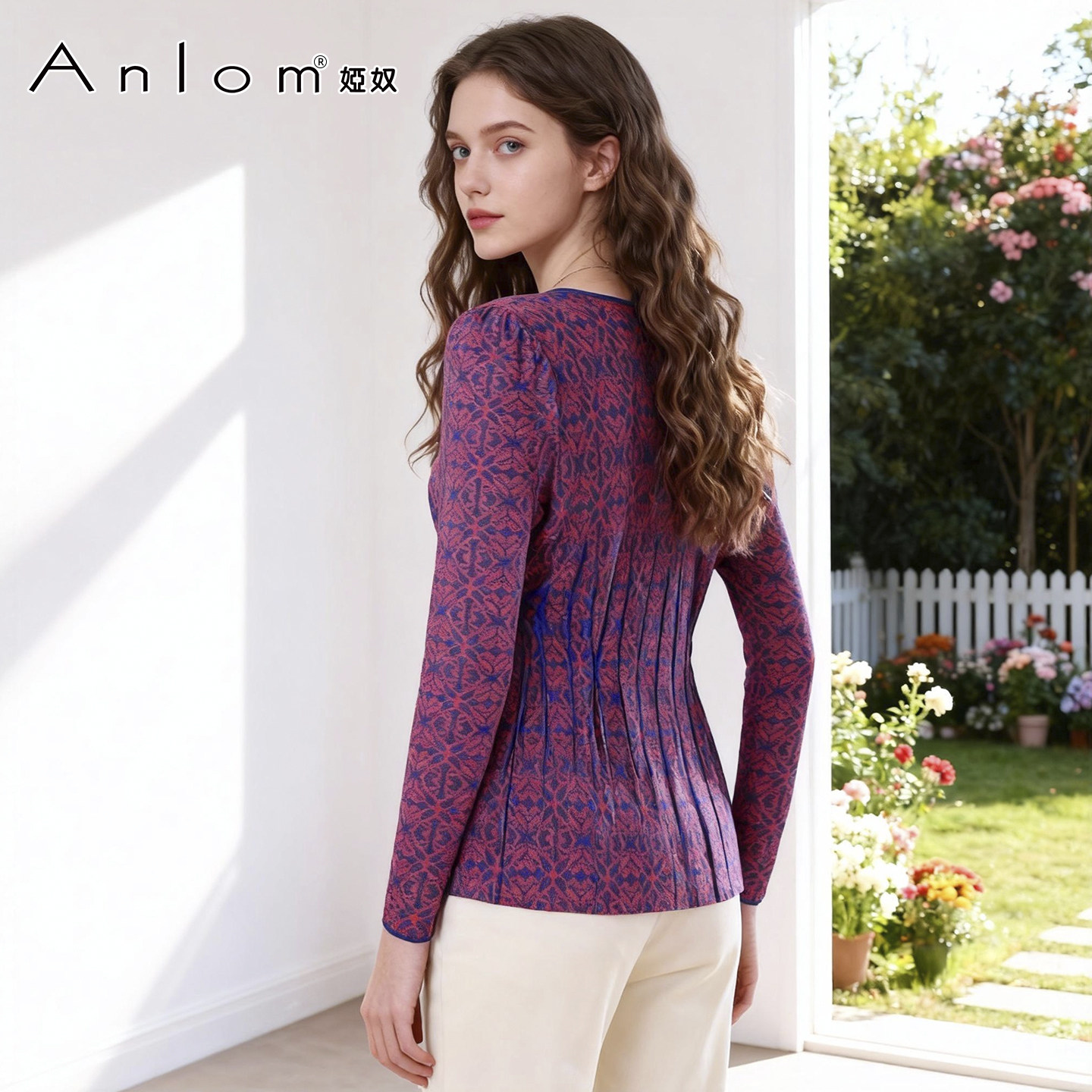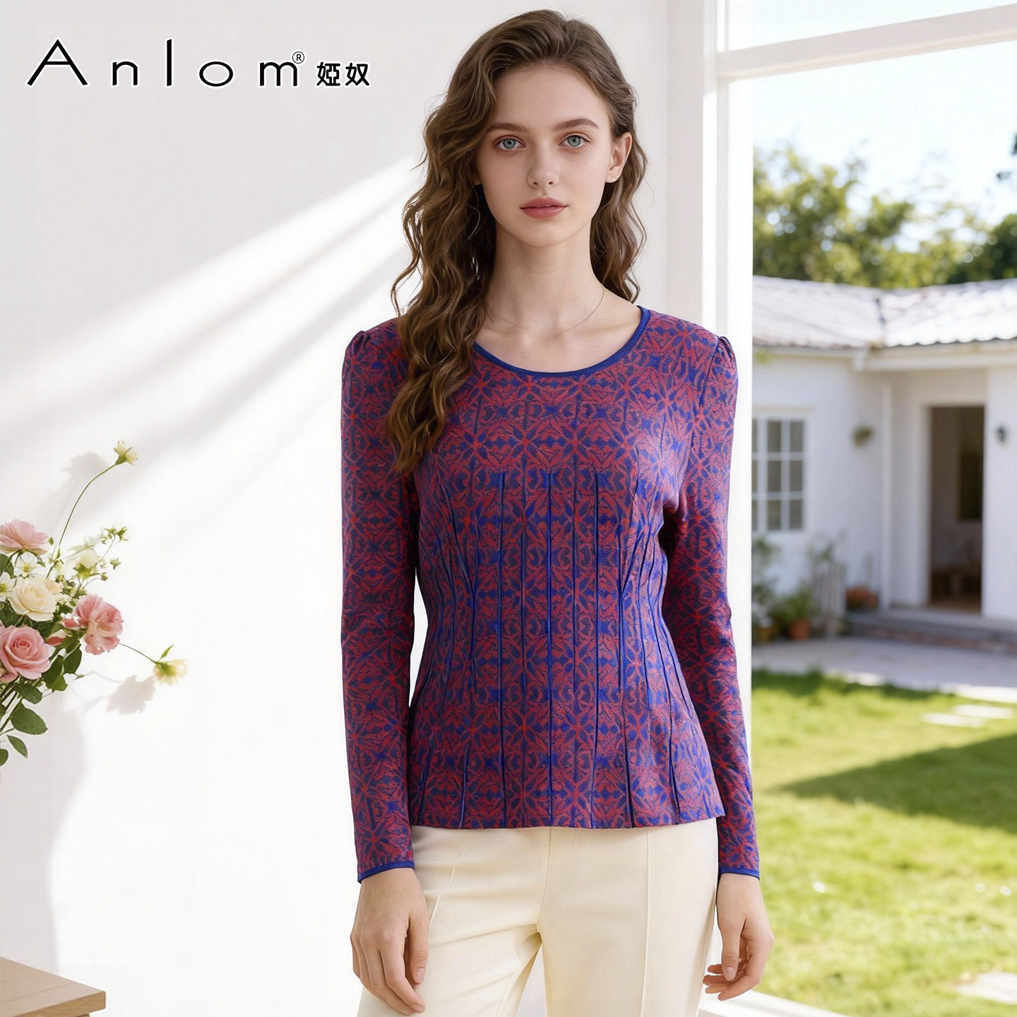 修身 Anlom 低圆领针织女上衣 桑蚕丝套头衫 长袖 娅奴秋新款 时尚由