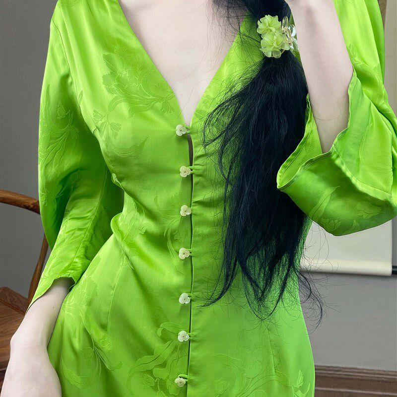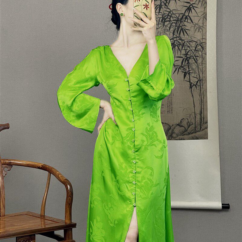 连衣裙法式 复古单排扣裙子收腰国风长裙夏 改良真丝提花长袖 新中式