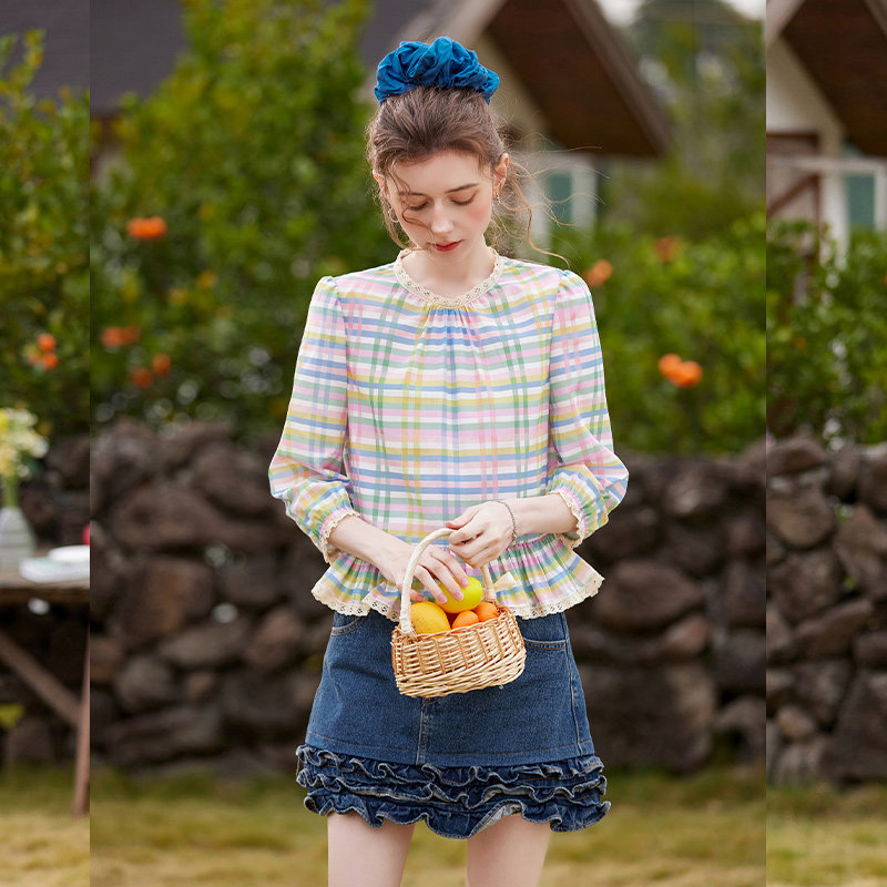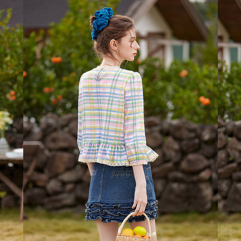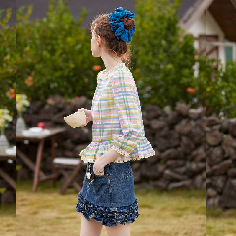 26春新款 甜美少女蕾丝花边上衣 浪漫荷叶边拼接格纹衬衫 白鹿语法式