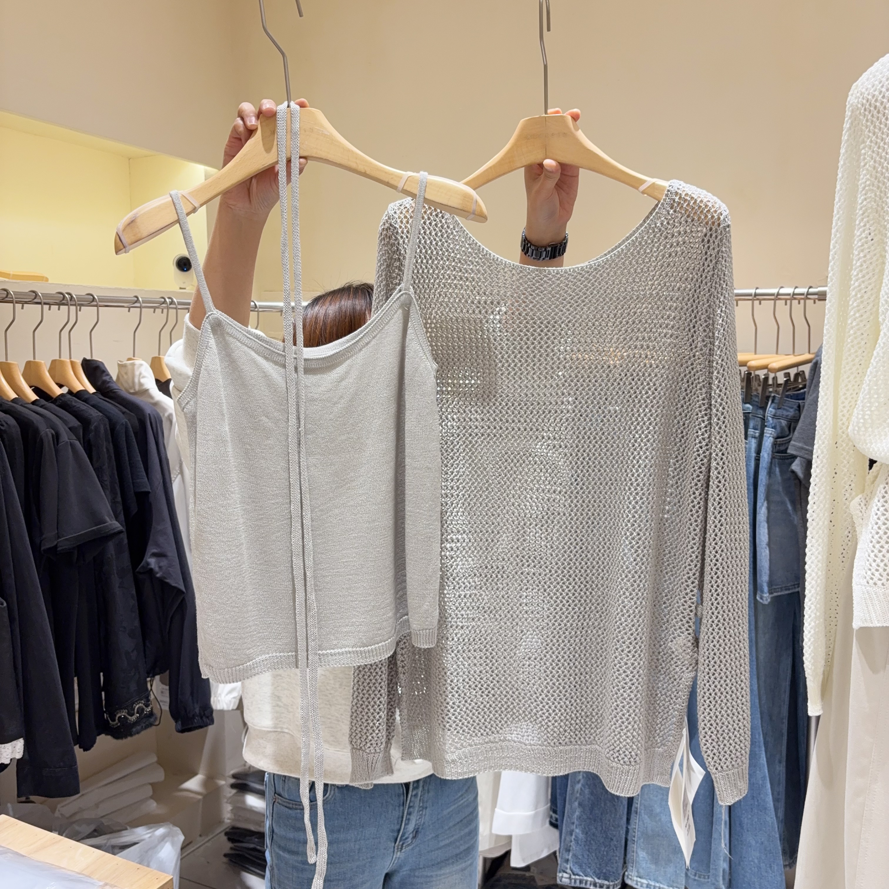 太太太洋气啦 吊带两件套女上衣套装 百搭罩衫 韩系辣妹镂空针织衫由
