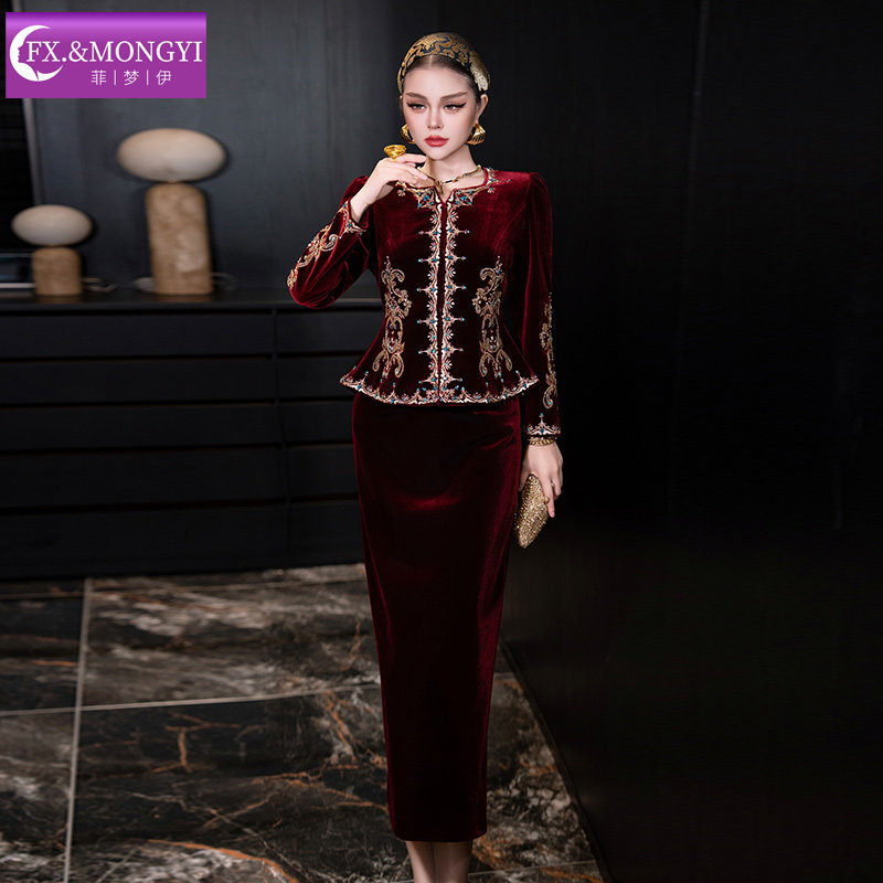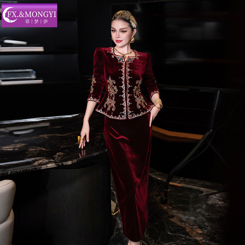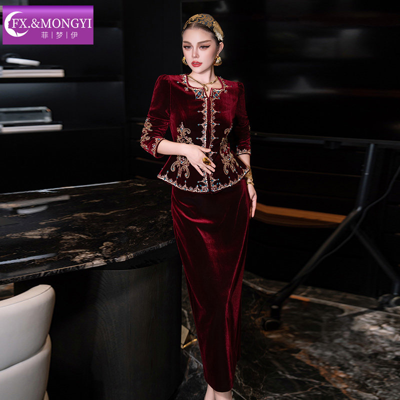 菲梦伊原创刺绣金丝绒红色套装 国风荷叶边气质上衣包臀半裙 女秋季