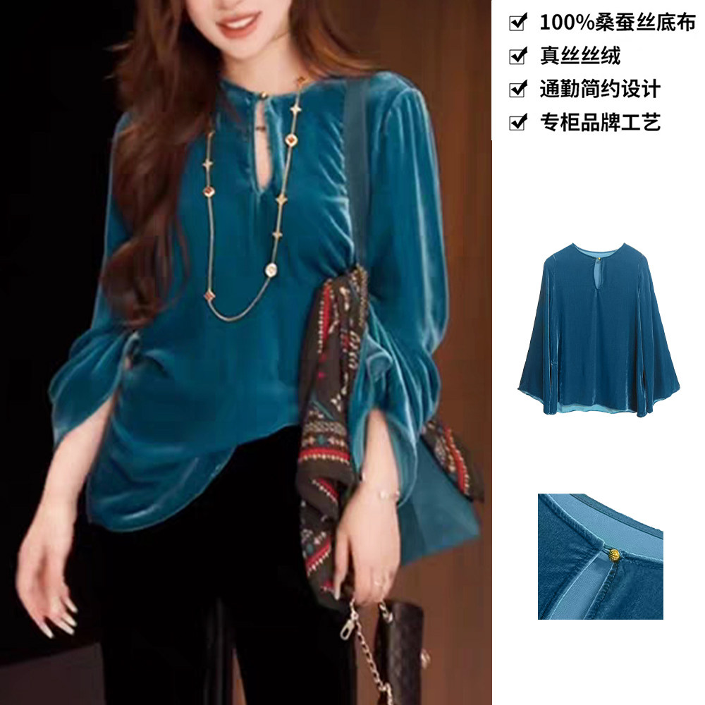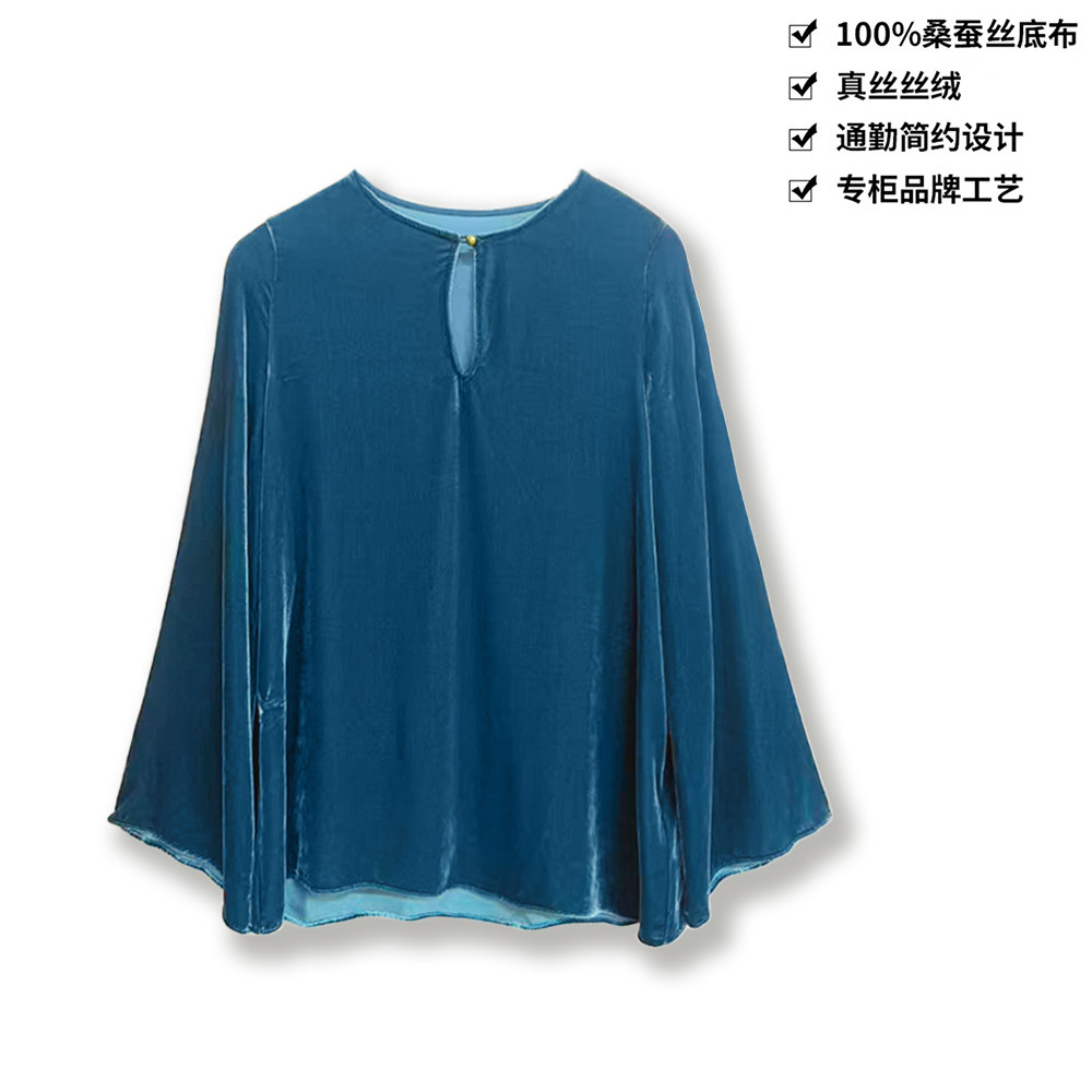 为您提供商品100桑蚕丝丝绒2025秋季 水滴领花瓣袖 真丝丝绒衬衫 上衣CXA18 新款的详细介绍,