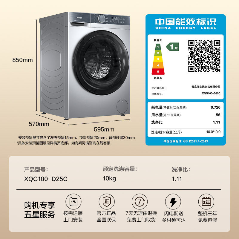 海尔滚筒洗衣机家用全自动超薄10公斤大容量洗脱一体25 换新补贴由