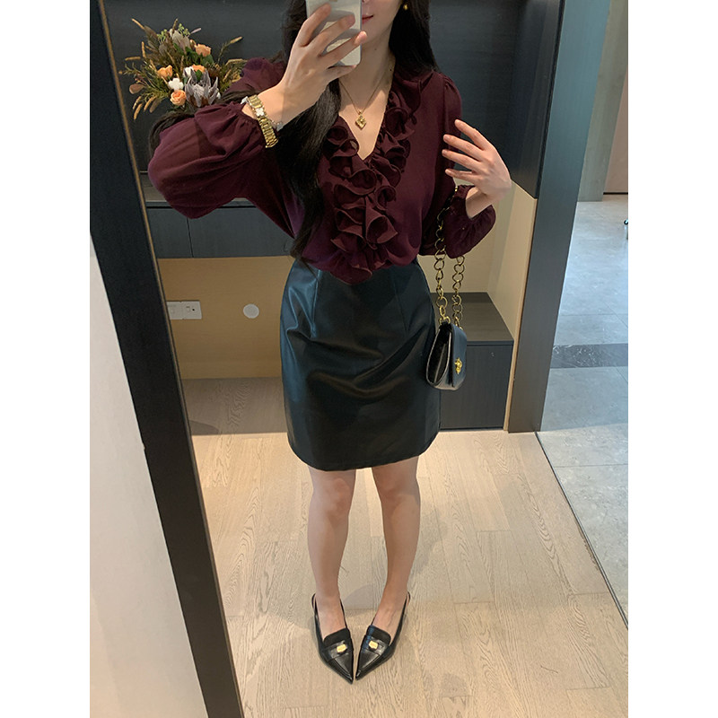 XINYI 秋季 高腰PU皮半身裙女中长款 显瘦百搭气质直筒 紫鸢风信由