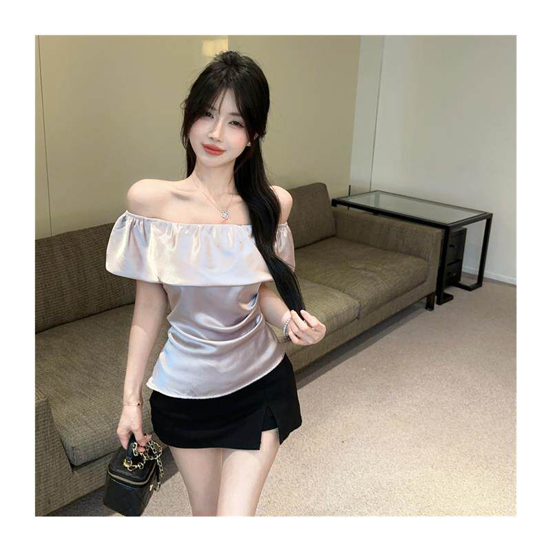 新款 法式 气质一字肩荷叶领短袖 T恤女夏季 显瘦露肩短上衣 纯欲修身