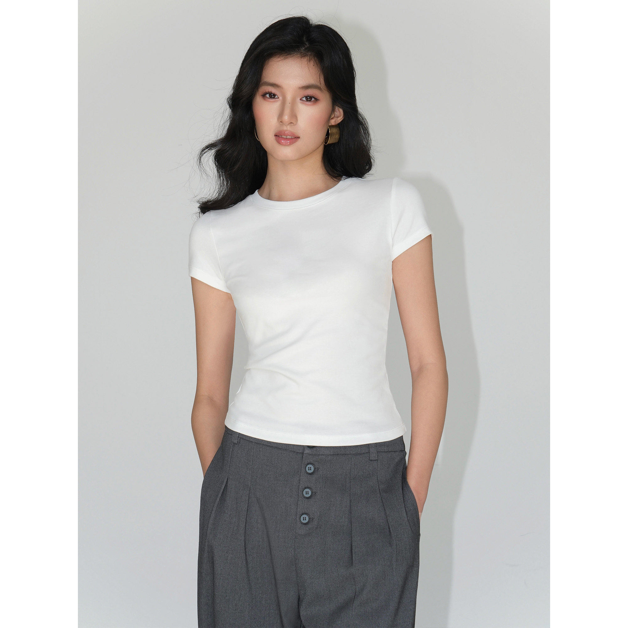 圆领紧身百搭气质短款 NEVA 针织上衣 t恤女基础款 短袖 白色修身由