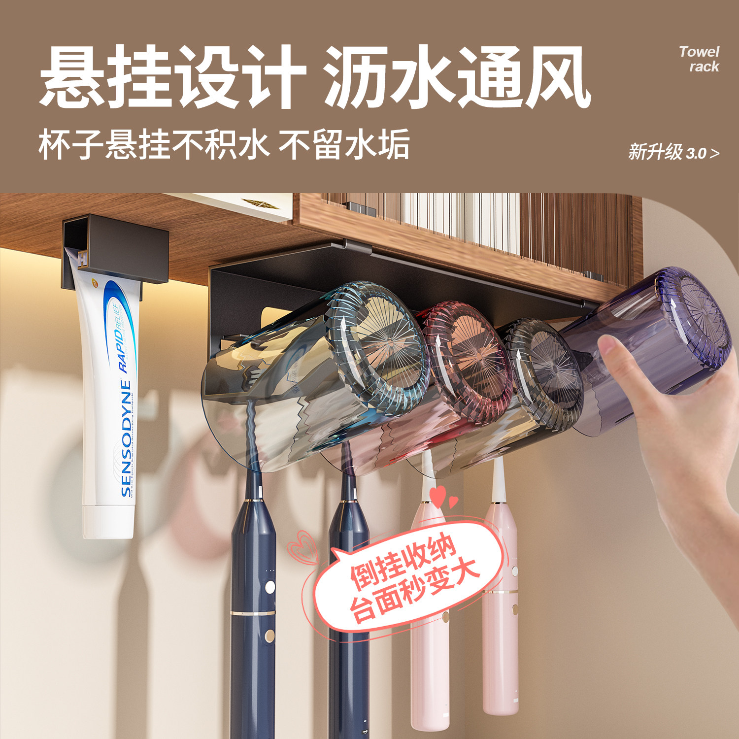 免打孔镜柜下漱口杯刷牙杯牙具电动牙刷架 卫生间牙刷置物架壁挂式由