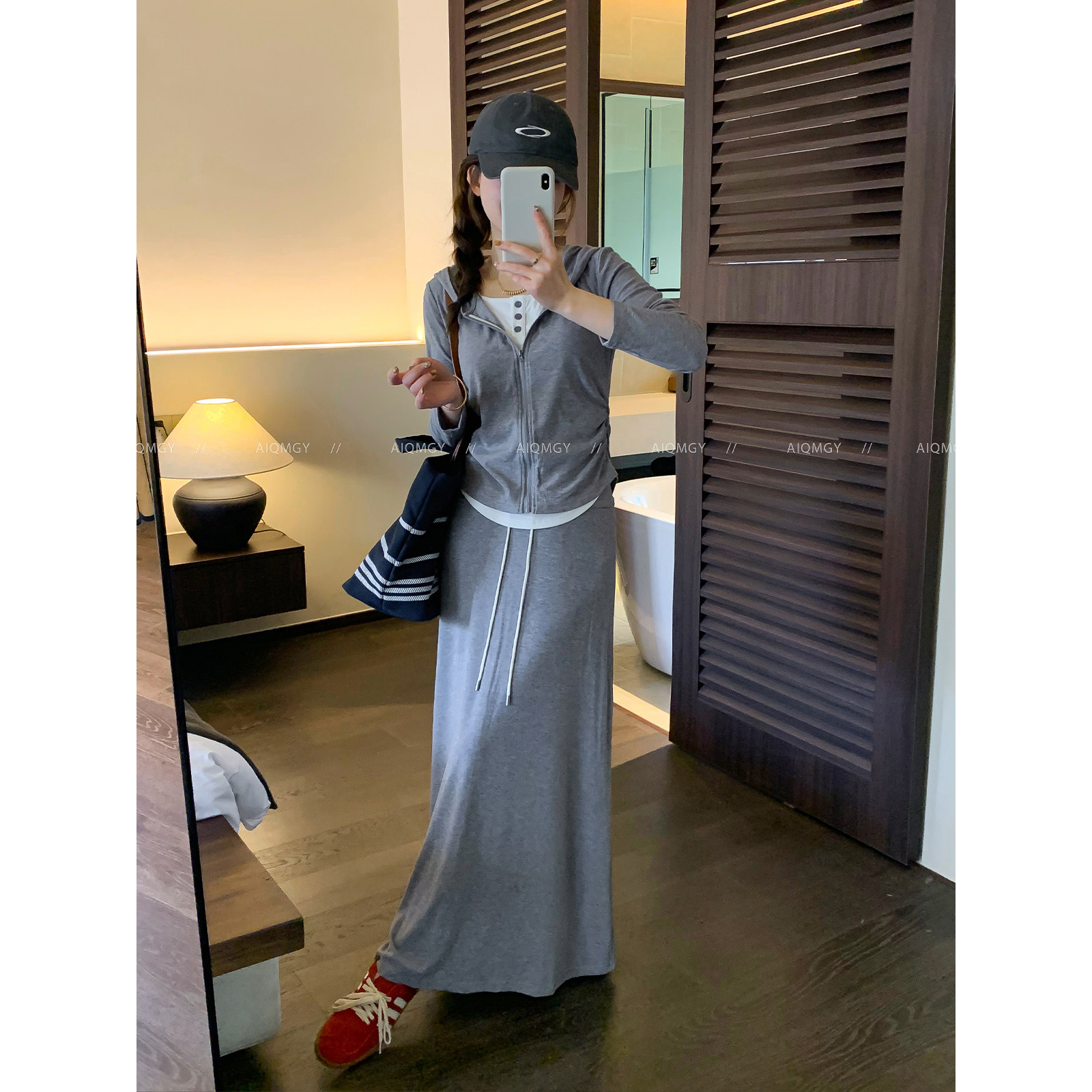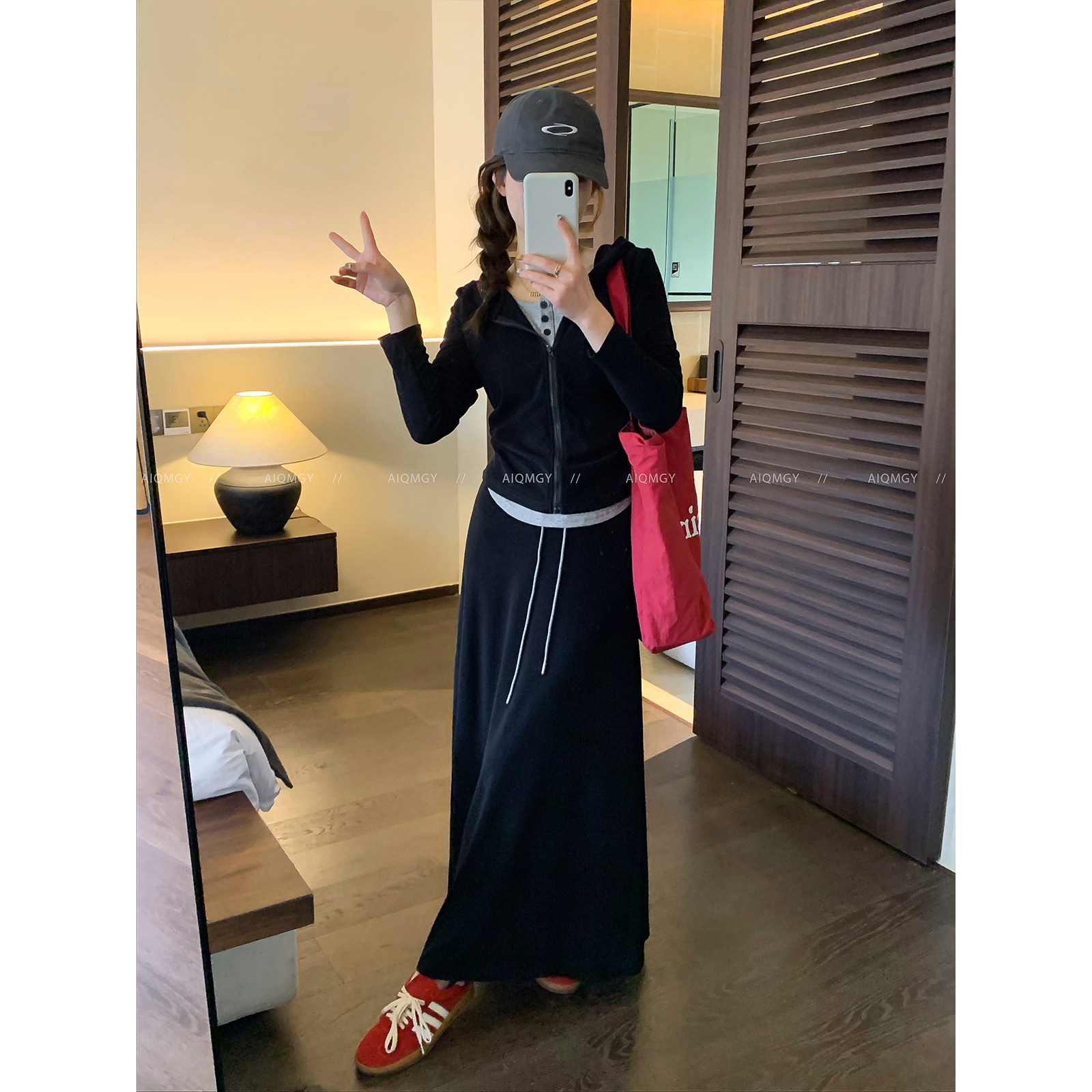 爱情魔鬼鱼 套装 裙女2026春季 拉链连帽上衣半身裙长裙两件套 时尚