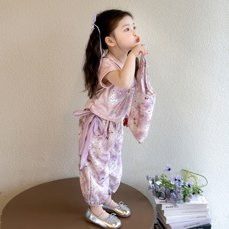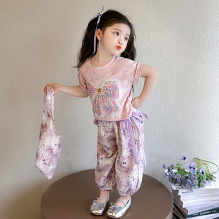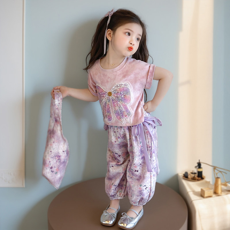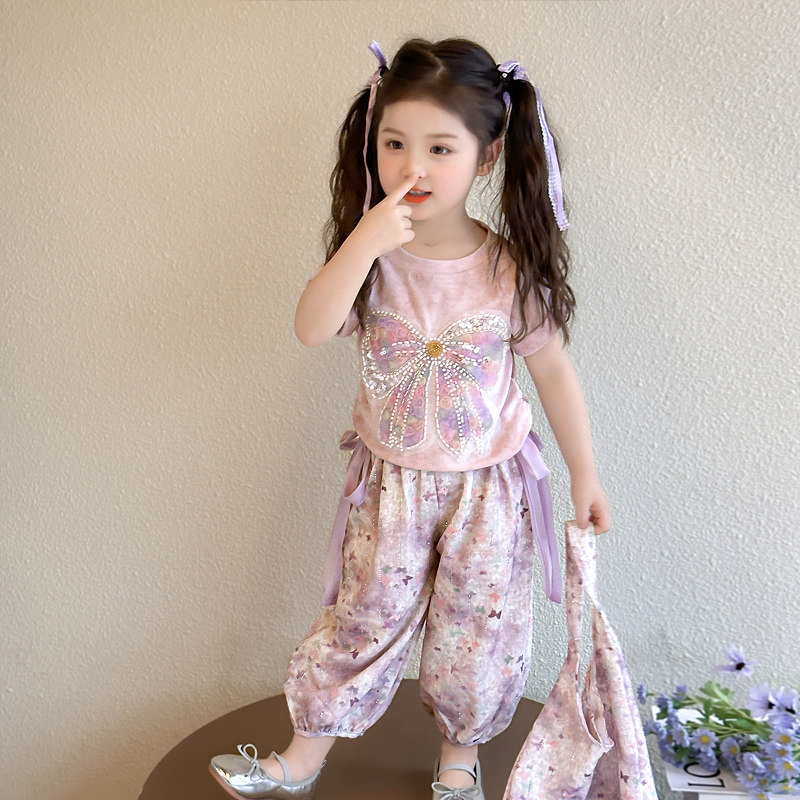 两件套防蚊裤 女童甜美风蝴蝶结套装 长裤 洋气休闲短袖 2026新款 夏季