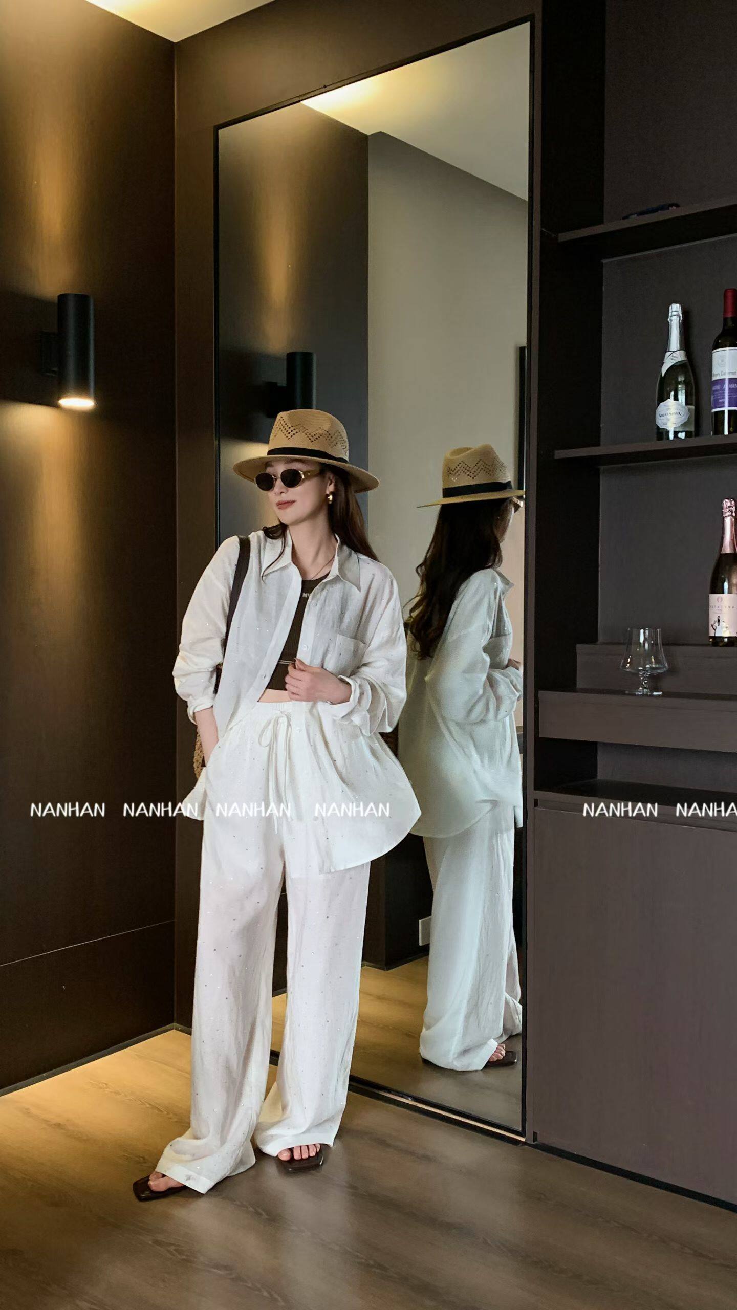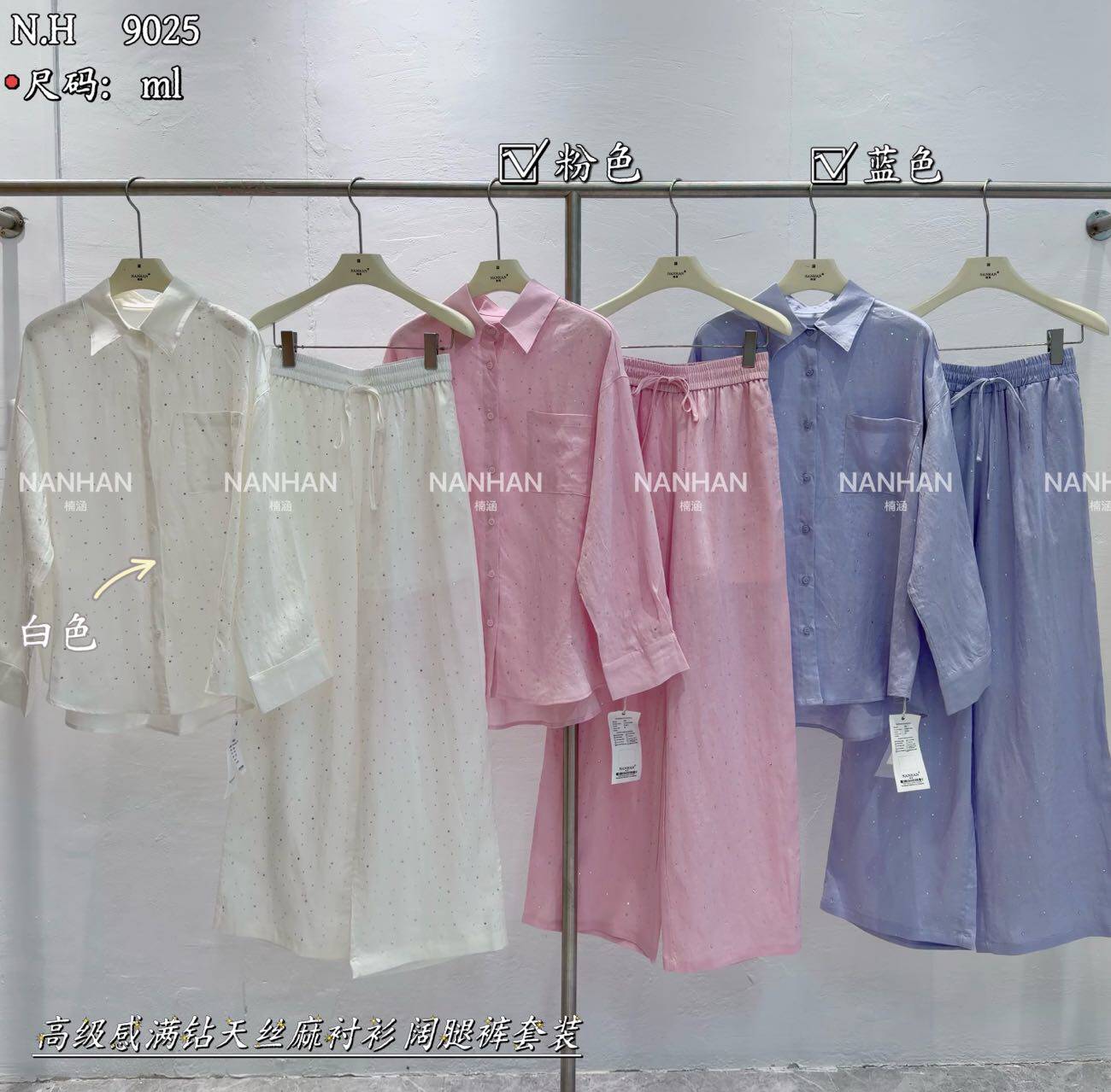 楠涵NANHAN正品 阔腿裤 慵懒百搭套装 2026春翻领满钻天丝麻料衬衣