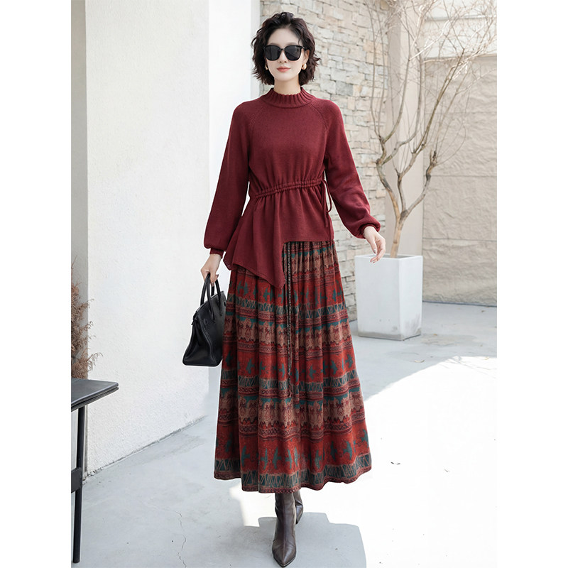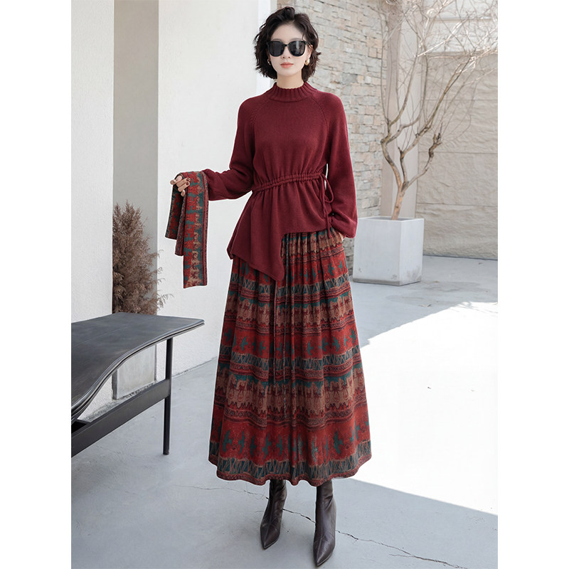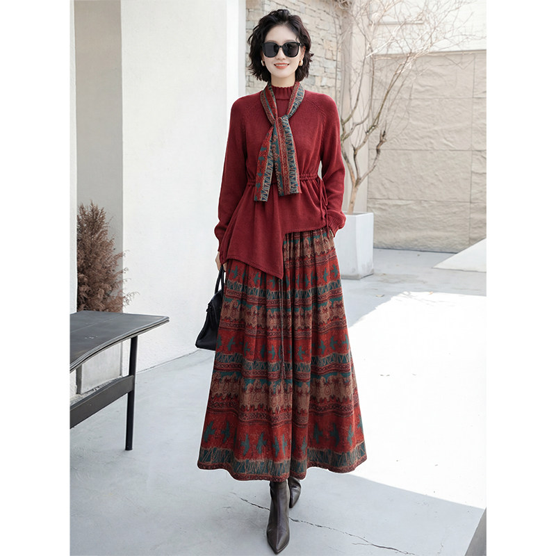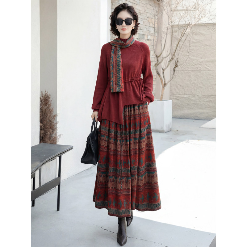 为您提供商品毛针织衫 复古小众半身裙两件套 女2026早春时尚 红色文艺民族风套装的详细介绍,