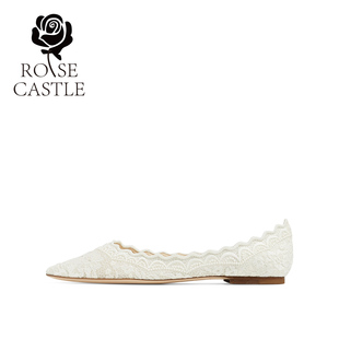 主婚纱新娘鞋 rosecastle 月下蔷薇婚鞋 女白色蕾丝尖头平底鞋 单鞋