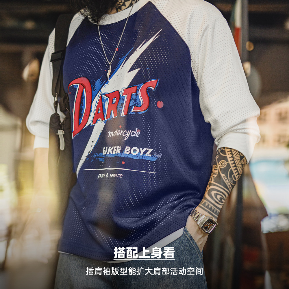 马登工装 印花长袖 T恤镂空撞色针织插肩袖 垂感套头卫衣男夏春 美式由