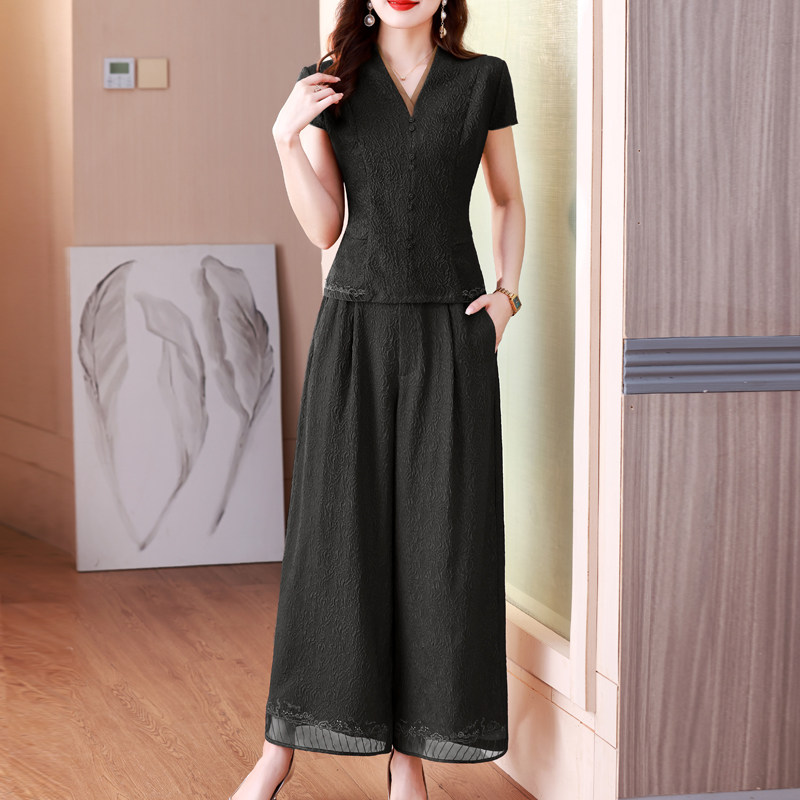 高端品牌洋气中老年妈妈阔腿裤 两件套 国风旗袍仿香云纱套装 新中式