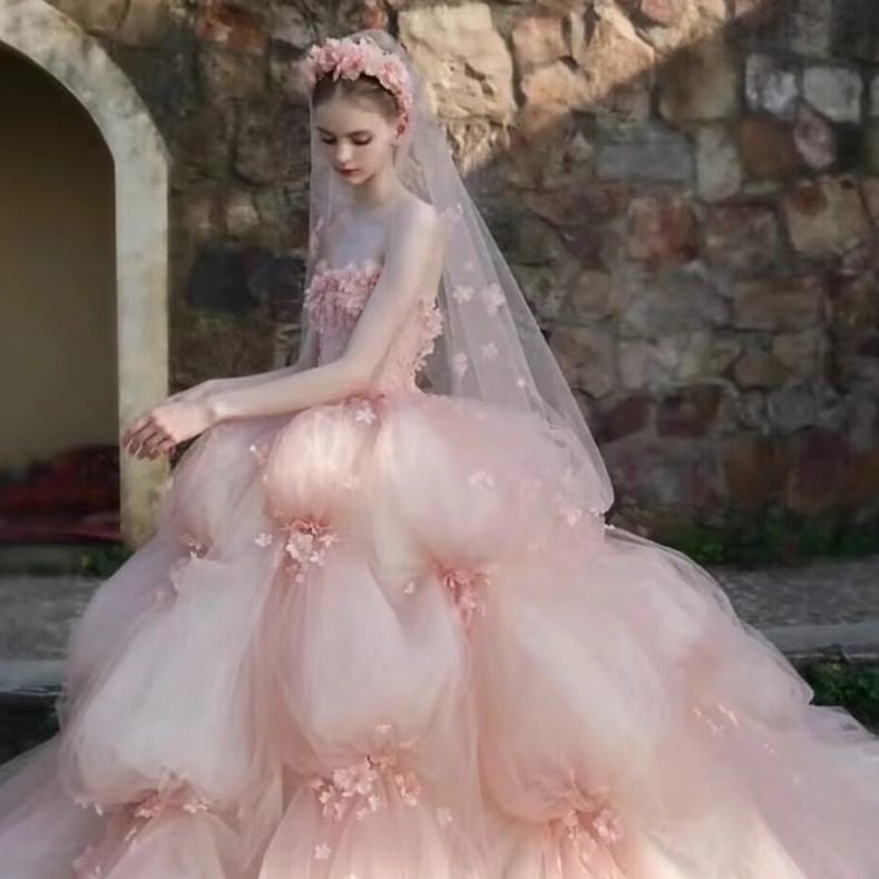新娘粉色花朵头纱花瓣婚纱摄影头饰长蓬蓬纱森系结婚晨袍拍照道具