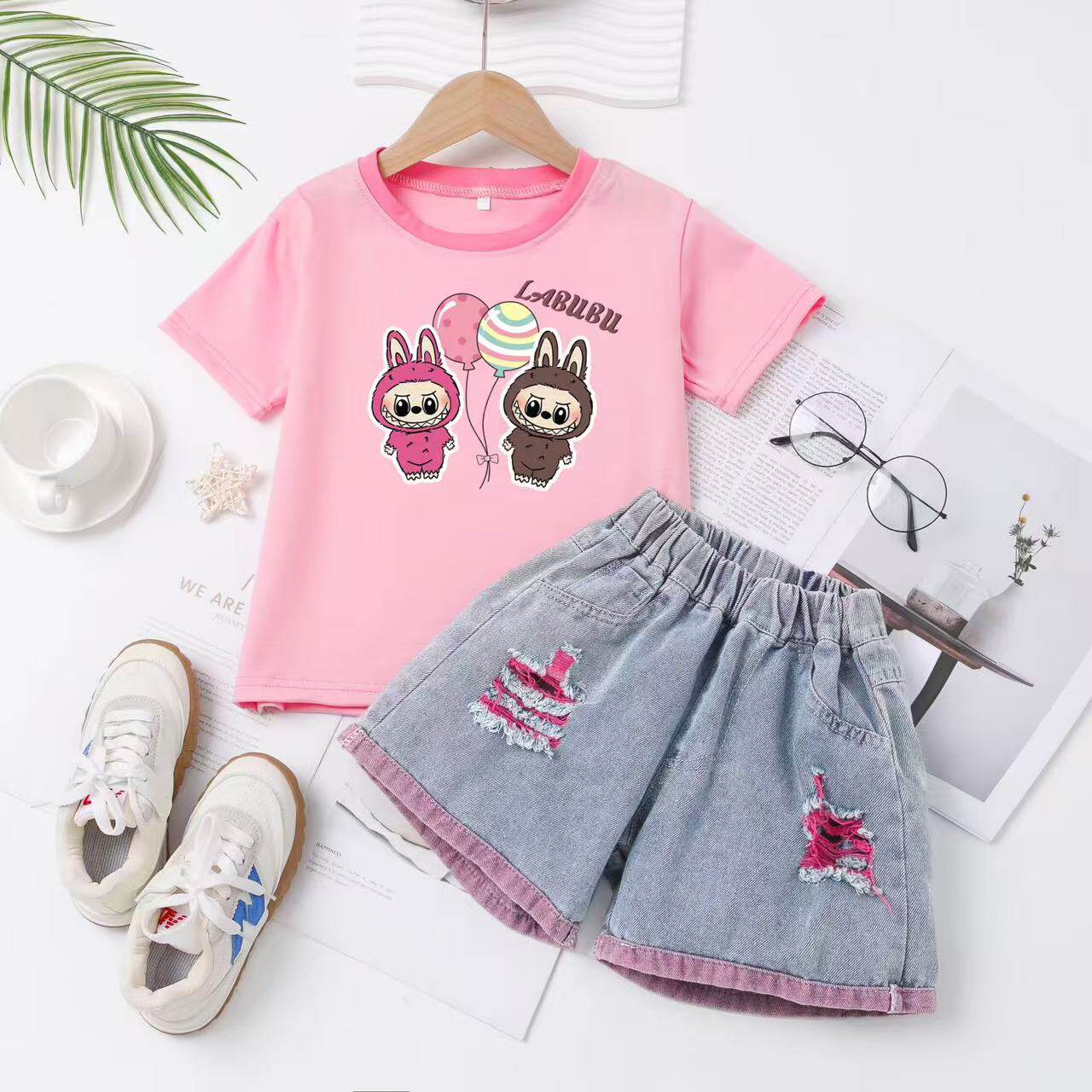 女孩洋气哪吒T恤牛仔短裤 女童短袖 两件套潮 童装 新款 套装 2025夏季