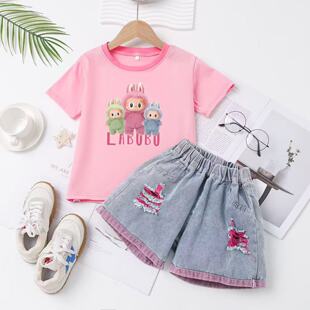 女孩洋气哪吒T恤牛仔短裤 女童短袖 两件套潮 童装 新款 套装 2025夏季由
