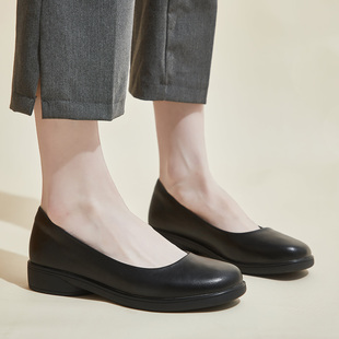 圆头低跟3cm厚底女式 平底黑色女单鞋 软底上班舒适工作鞋 浅口皮鞋