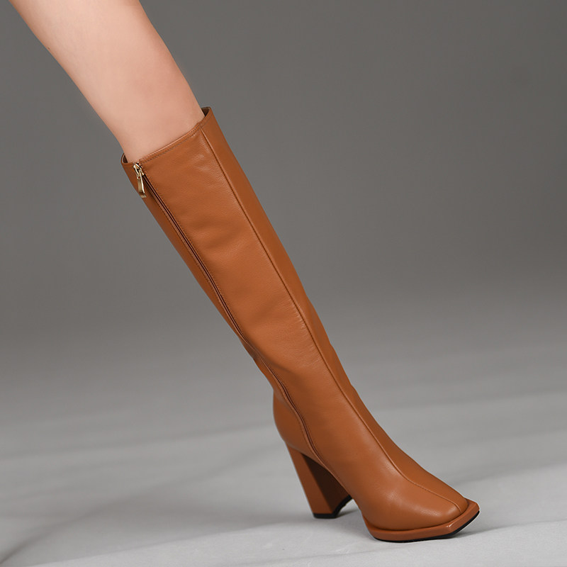 misili 新款 高跟鞋 棕色女靴子 9.8cm方头平底粗跟长靴女2026秋冬季由