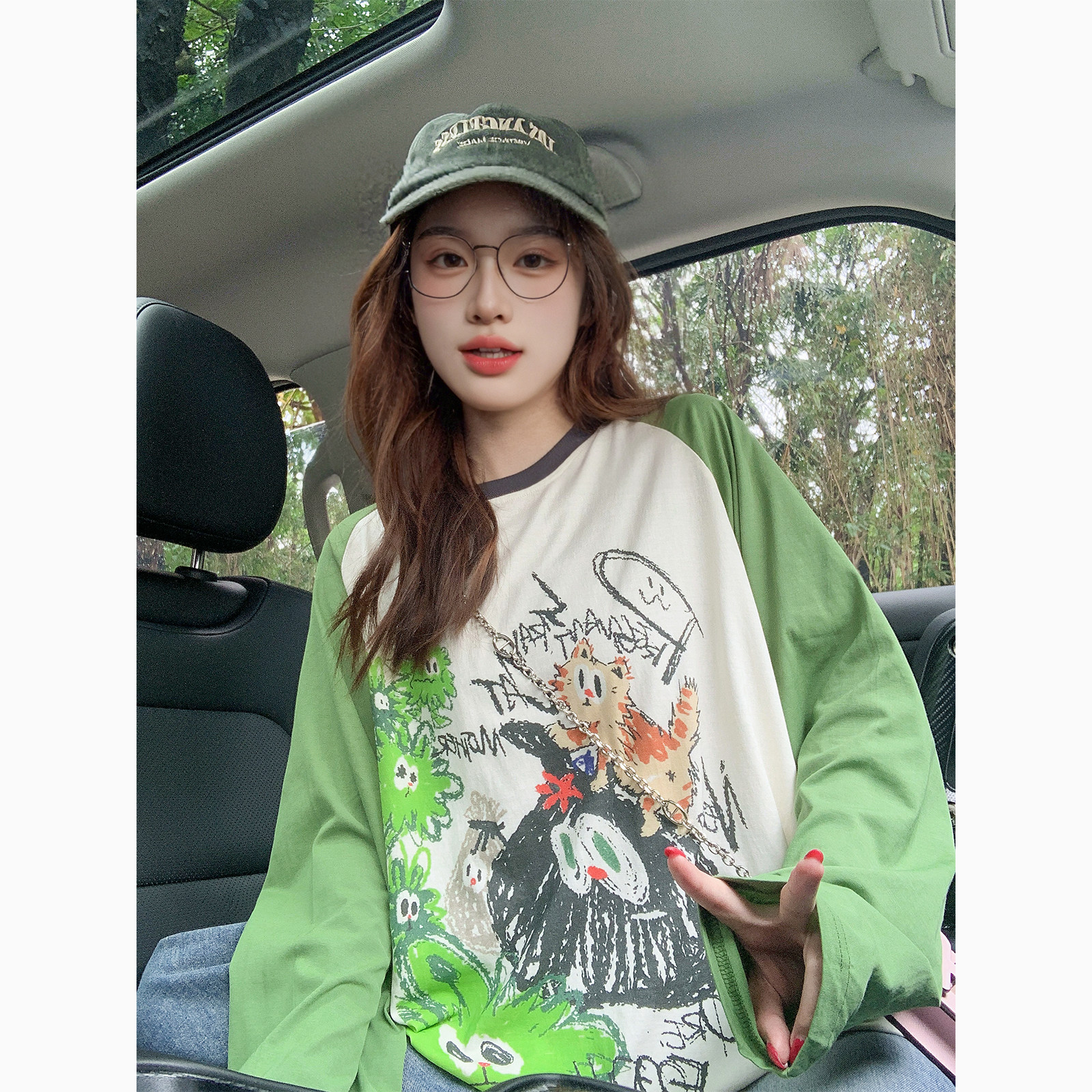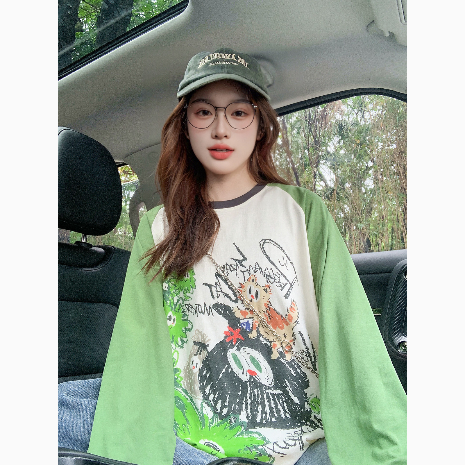 早秋卡通涂鸦复古慵懒风防晒罩衫 上衣 t恤女2025新款 撞色插肩长袖