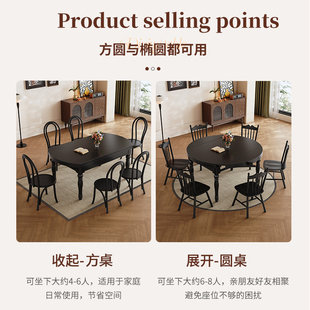 实木餐桌可伸缩方变圆桌胡桃木色小户型家用复古折叠吃饭桌子 美式