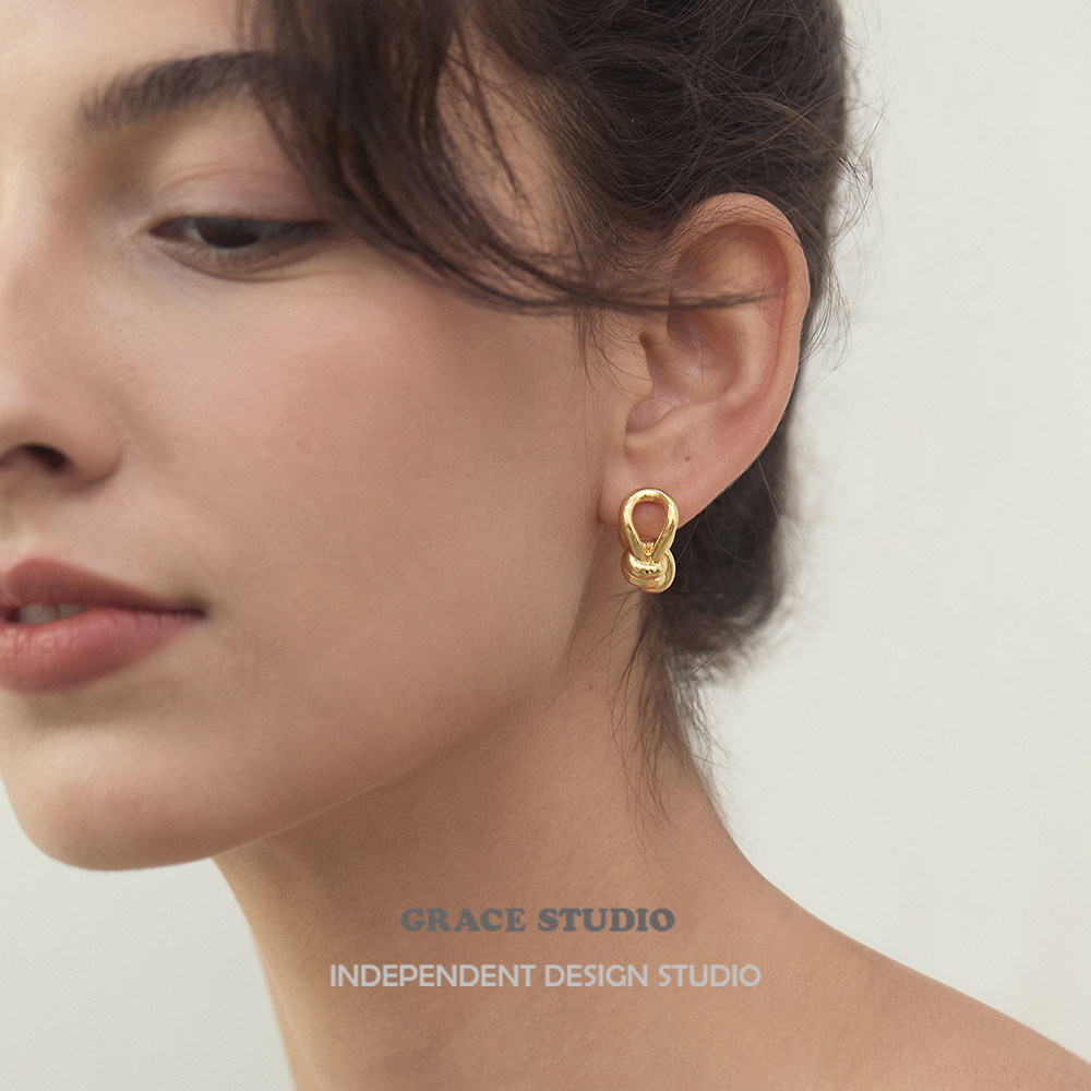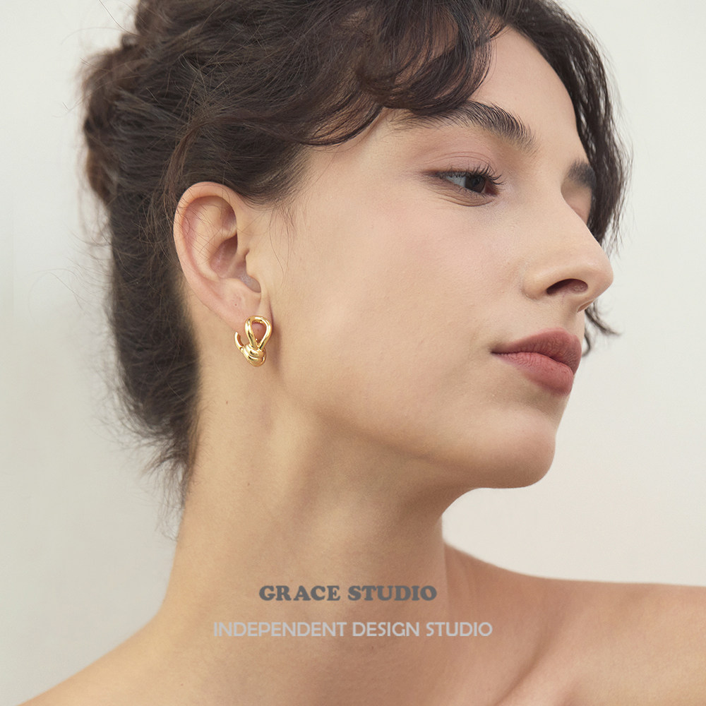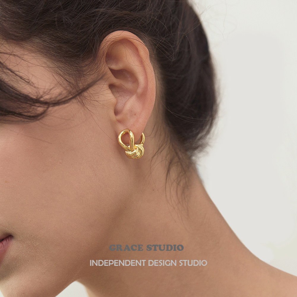高级感小众设计金属绳结耳扣耳圈时髦金色ins风耳环 S巴黎街头