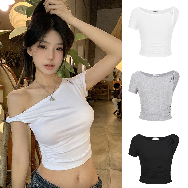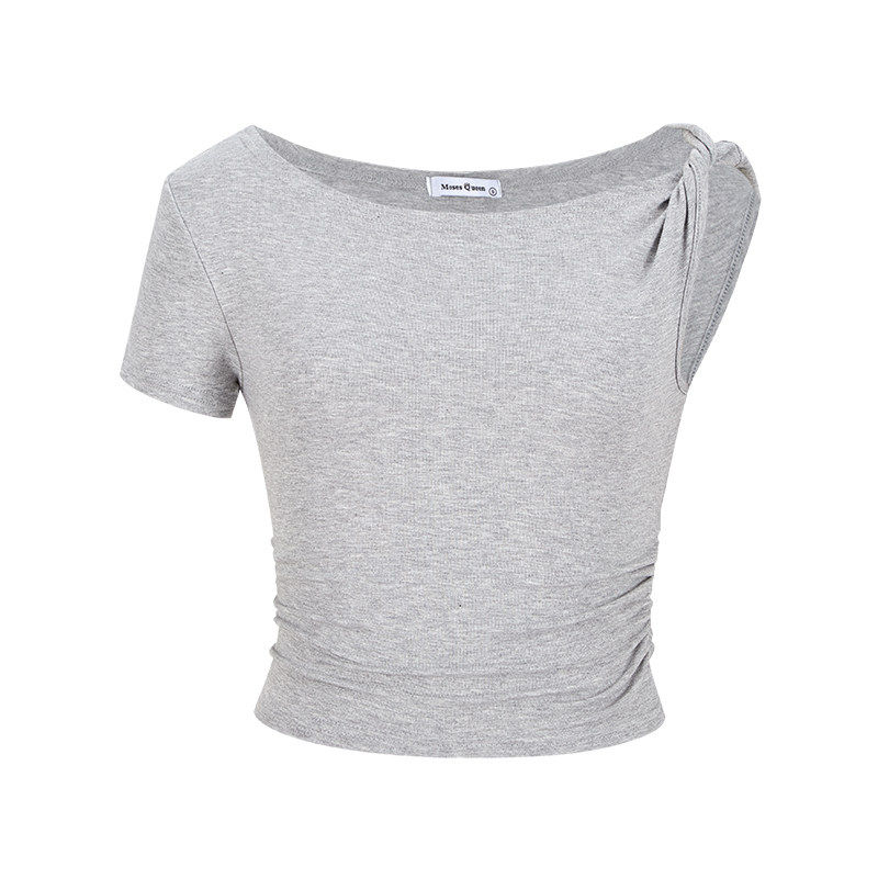 显瘦露脐短款 上衣 t恤女夏修身 MosesQueen魔西女王斜肩不规则短袖