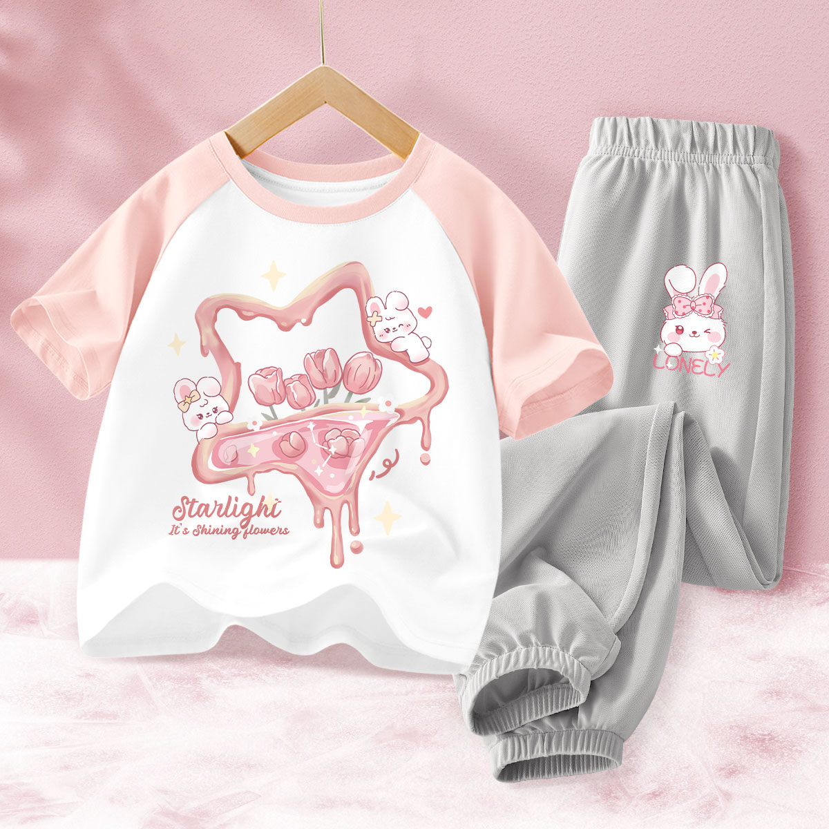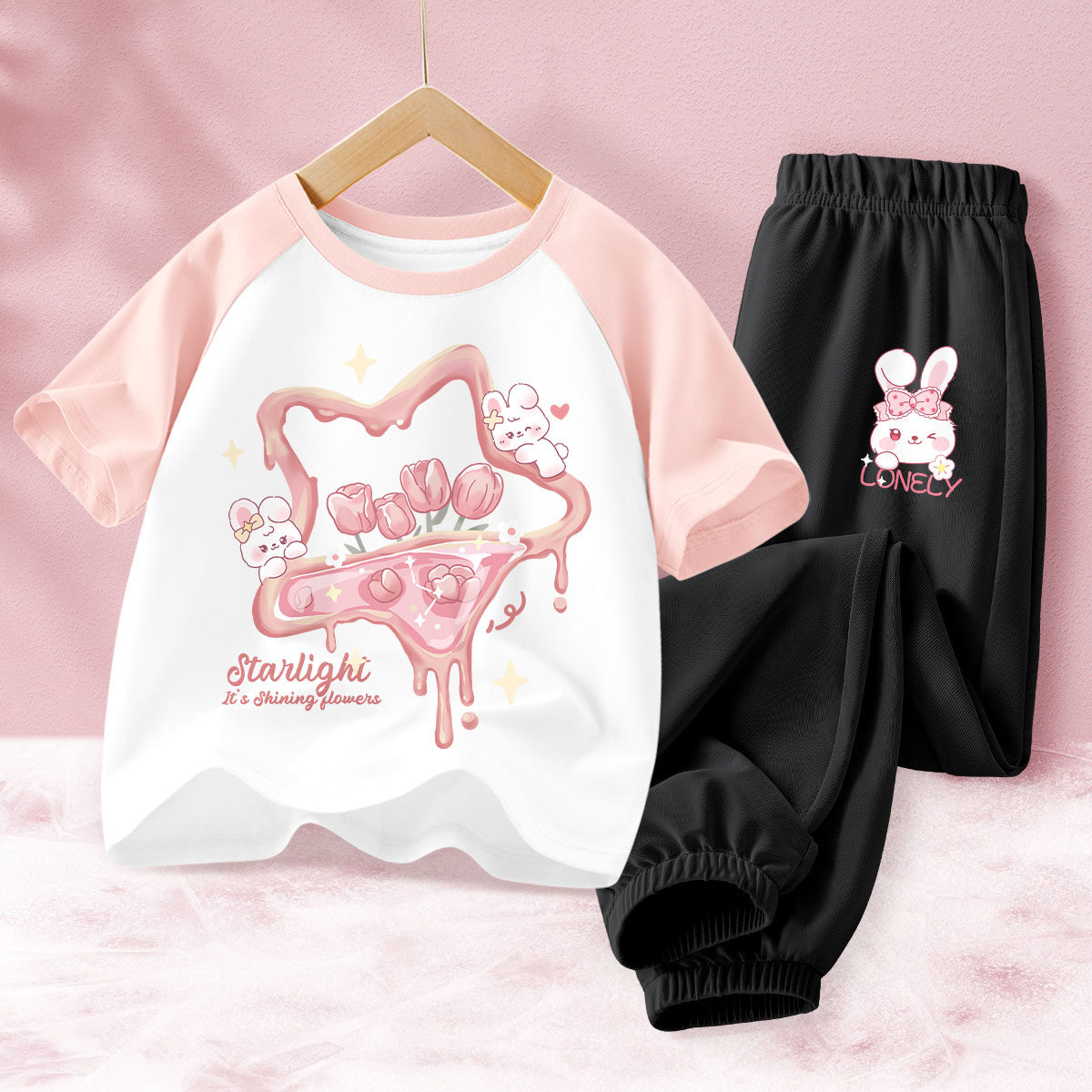 夏季 女童洋气时尚 新款 女 套装 夏装 防蚊裤 短袖 童装 运动服两件套薄款