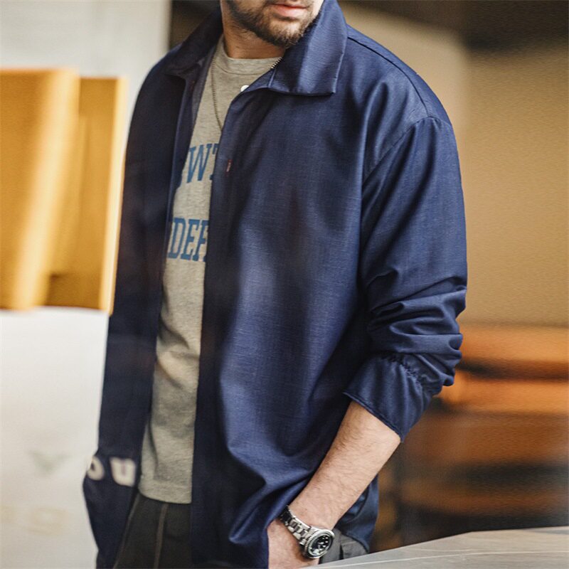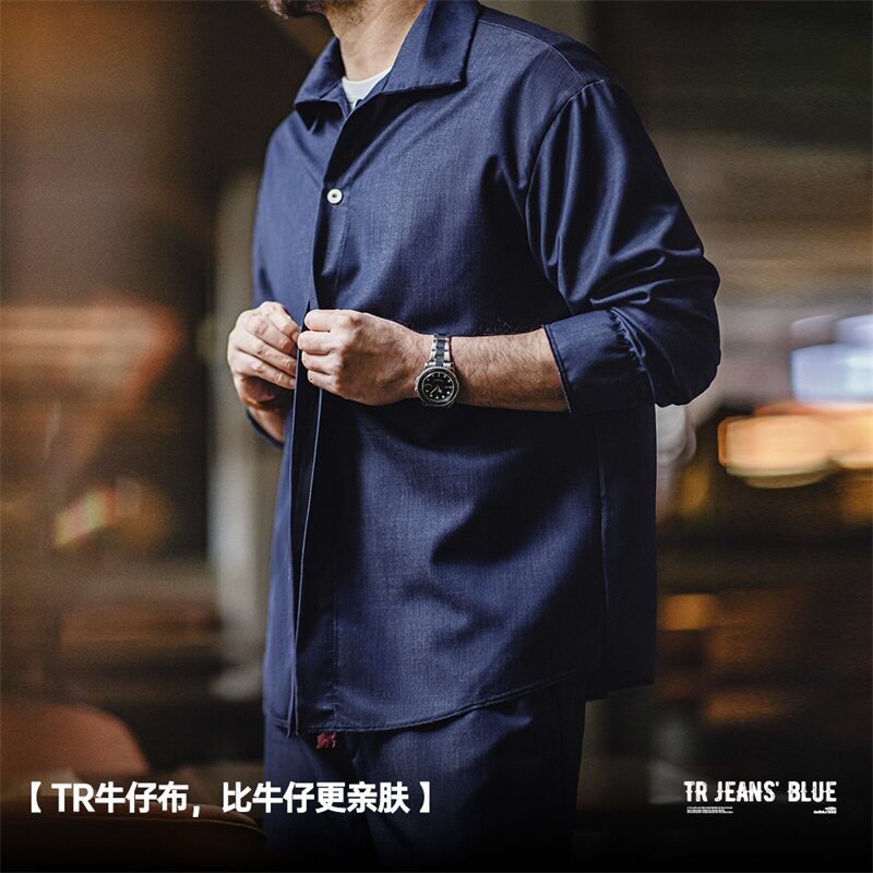 丹宁宽松翻领薄款 马登工装 美式 复古仿天丝牛仔衬衫 衬衣男春 长袖