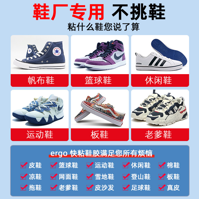 为您提供商品ergo瑞士进口速干补鞋 强力沾鞋 底鞋 厂专用502 帆布鞋 鞋 篮球鞋 专用胶水防水运动鞋 软胶粘鞋 子树脂万能胶黏皮鞋的详细介绍,