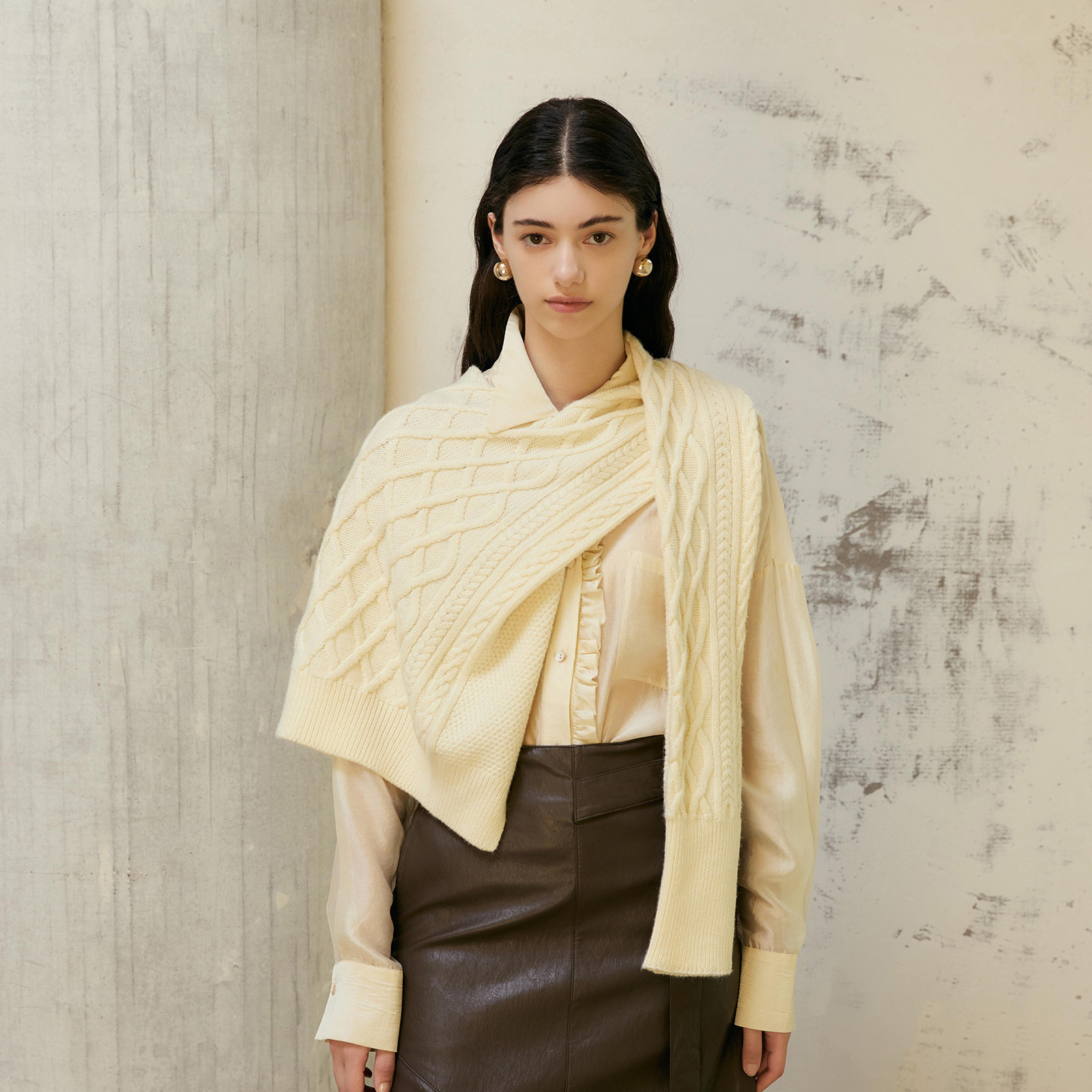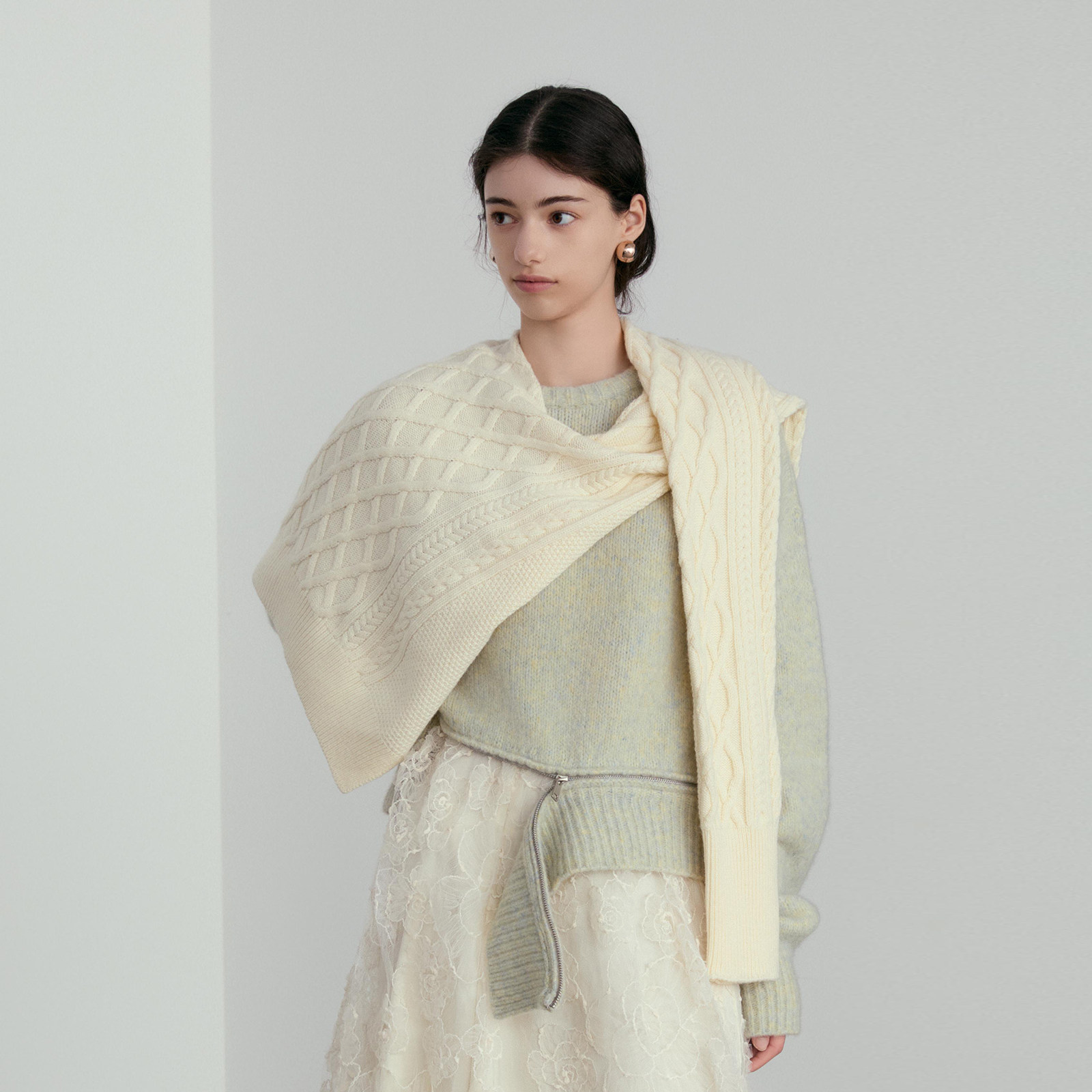 wana try绵羊毛针织花型披肩春秋新品 奶白韩系围巾女 明星同款由