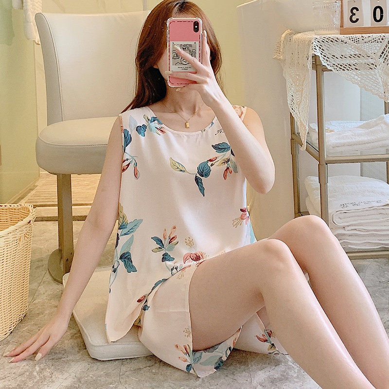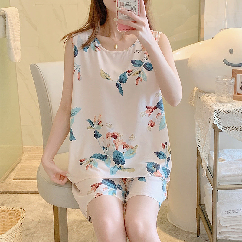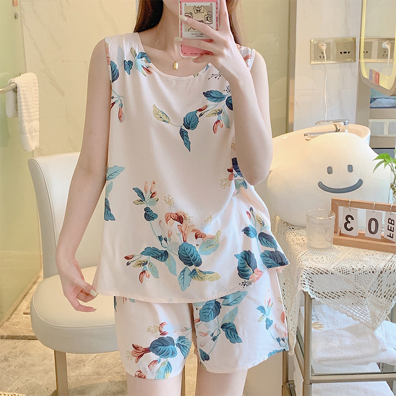 棉绸睡衣女夏薄款 人造棉家居服可外穿学生背心套装 加大码 宽松无袖
