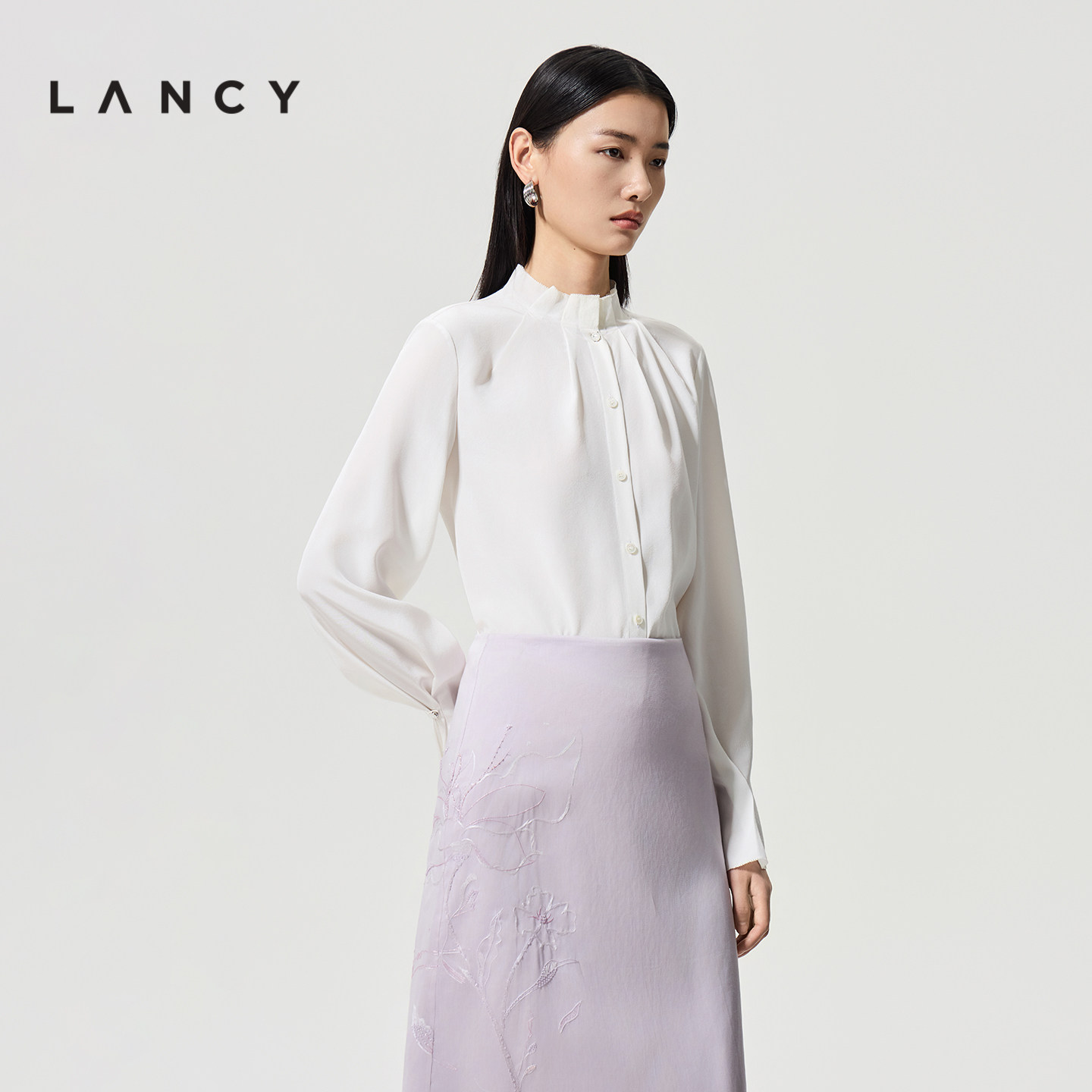 朗姿2026夏季 LANCY 真丝 通勤上衣 法式 宫廷风立领捏褶衬衫 新款
