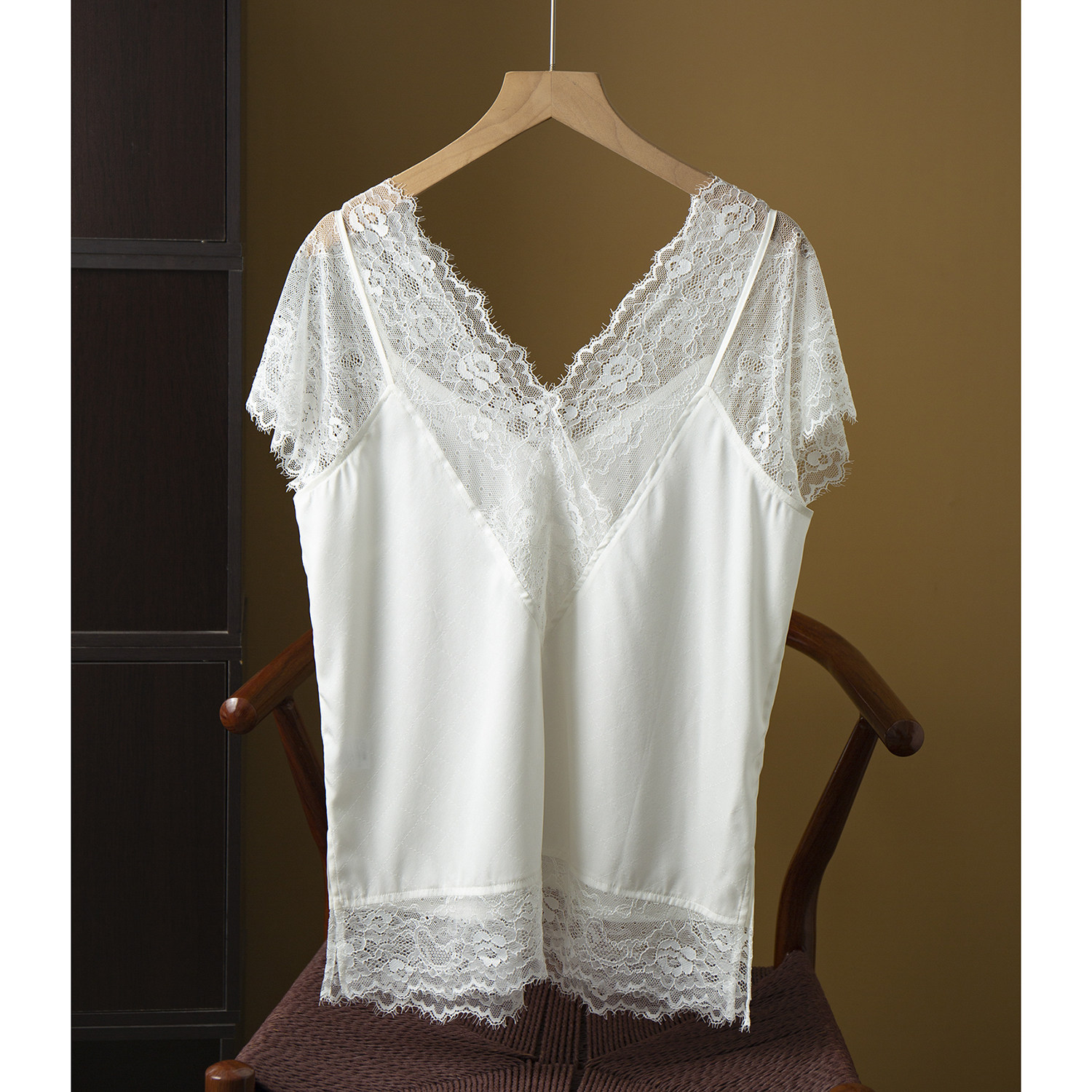 为您提供商品上衣女内搭打底衫 春 假两件蕾丝拼接桑蚕丝真丝提花缎V领短袖 高端的详细介绍,