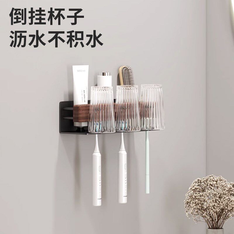 电动牙刷架收纳盒 牙刷置物架情侣牙杯漱口架子胡桃木免打孔壁挂式