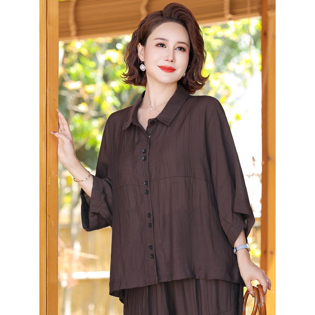 纯色两件套装 夏新中老年女装 妈妈装 气质大码 九分裤 子宽松翻领衬衫